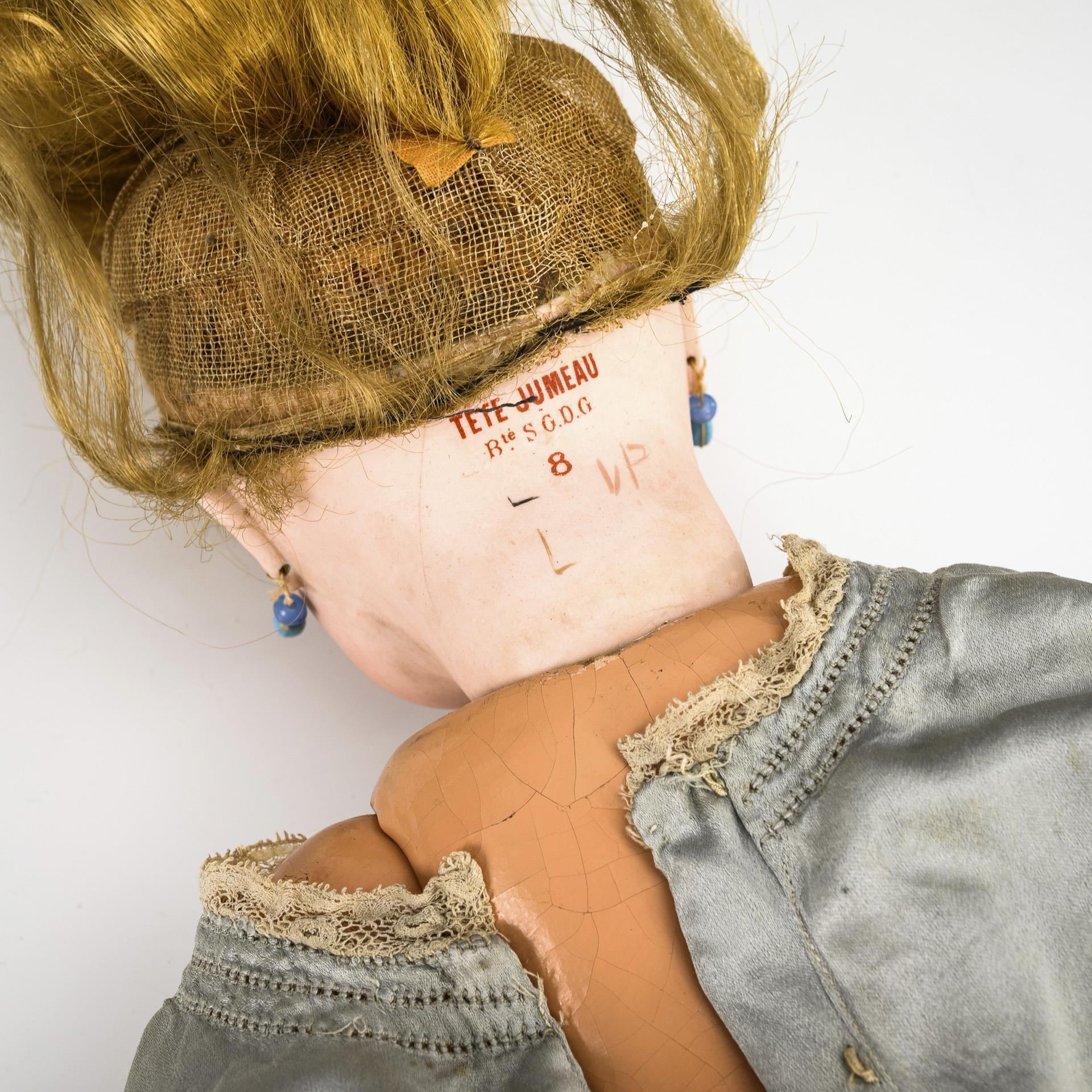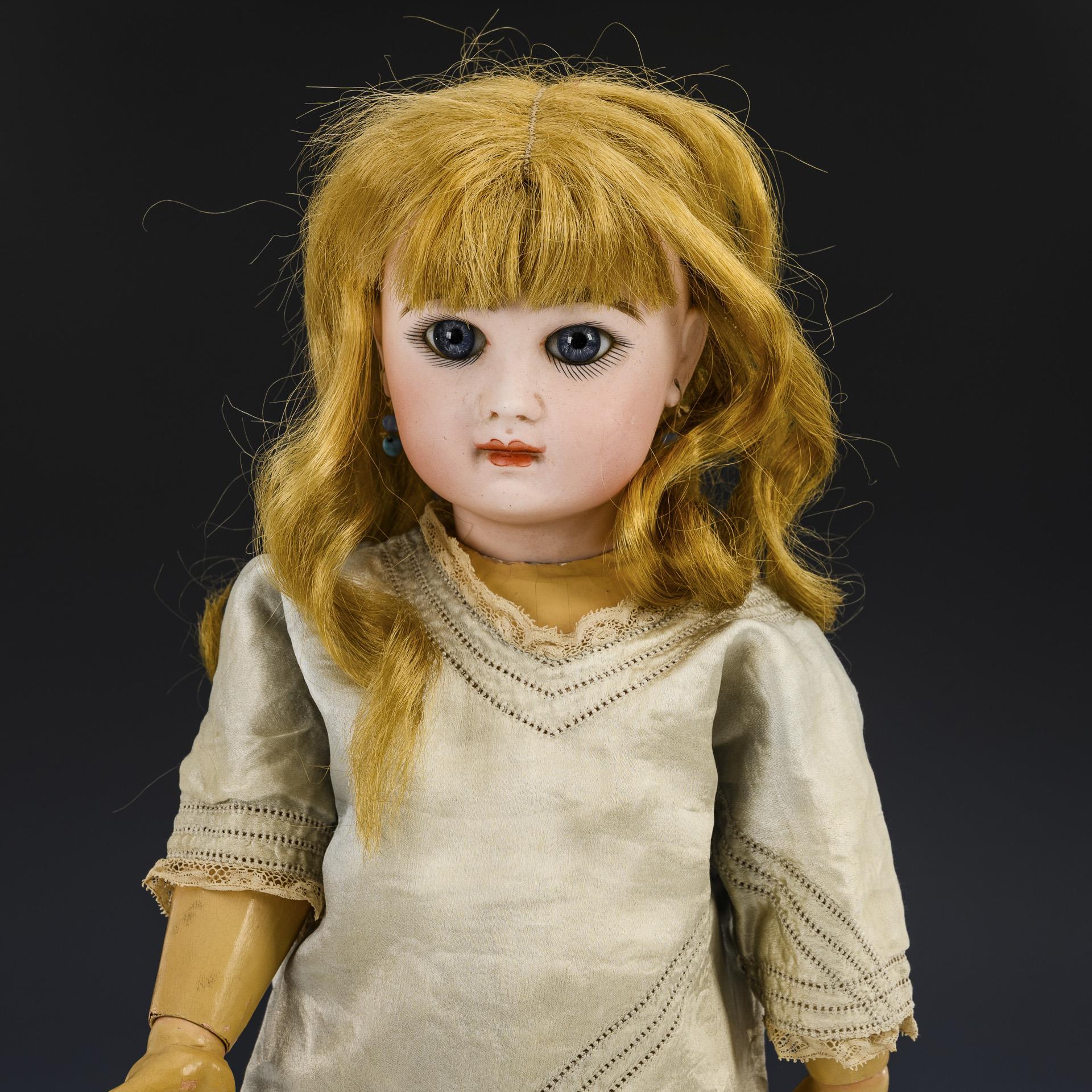 Crank head, blue paperweight eyes, earrings, blonde mohair beads. 11-piece articulated body. Light silk dress, white fabric shoes. Supplemented beads not removed, hairline crack at the back of the head, small chip at the neck crank, body painted over.