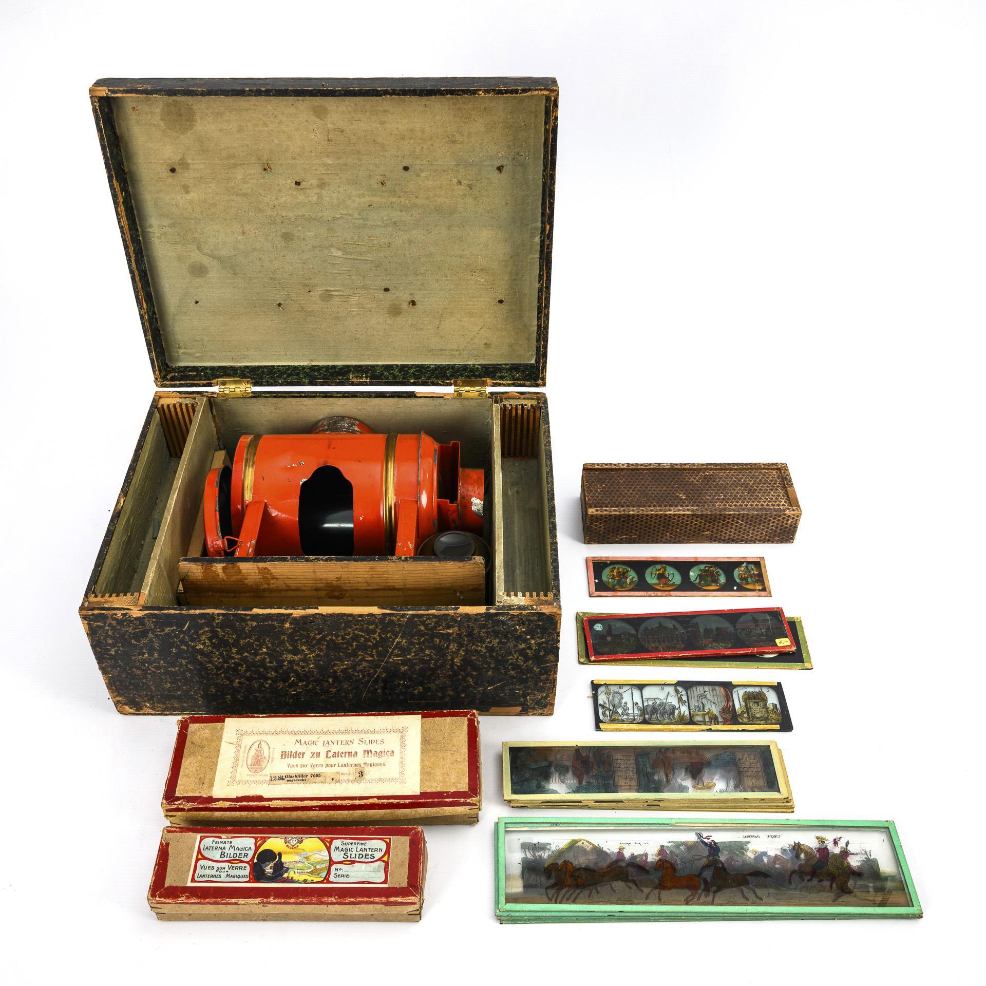 Red lacquered sheet metal body with removable lens and vent. In original Art Nouveau wooden case. Comes with glass slides in various sizes. Signs of age, defects.