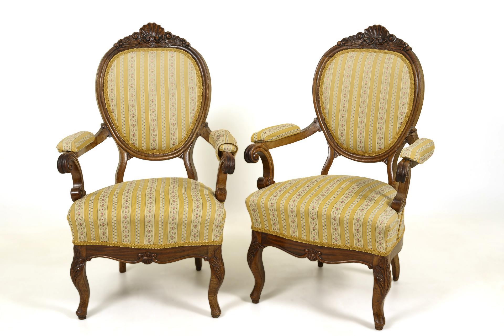Elegant pair of armchairs with balloon backrests, fluted frame with crowning shell decoration, upholstered armrests with end volutes, upholstered seat with cream and gold-colored striped fabric cover with floral repeat, on 4 curved feet with leaf reliefs. More recently upholstered and covered. Signs of age and wear, armrests glued, inactive anobia.