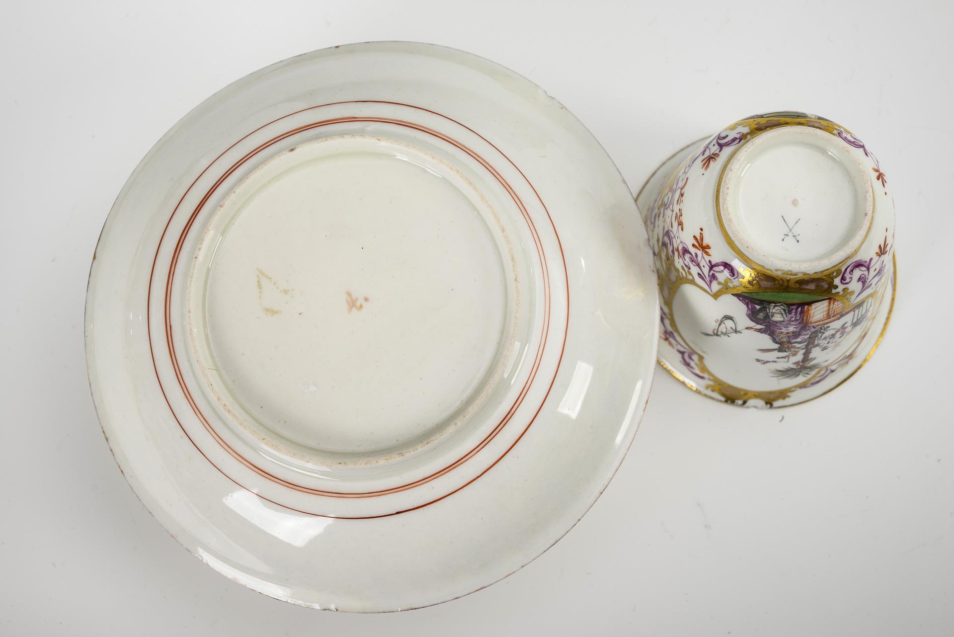 Cup: glazed blue sword mark and white turner's mark ●● (= Johann Martin Kittel Junior, *1706-† 1762), before 1739. Saucer: unmarked, rubbed gold paint number "4.", c. 1740.