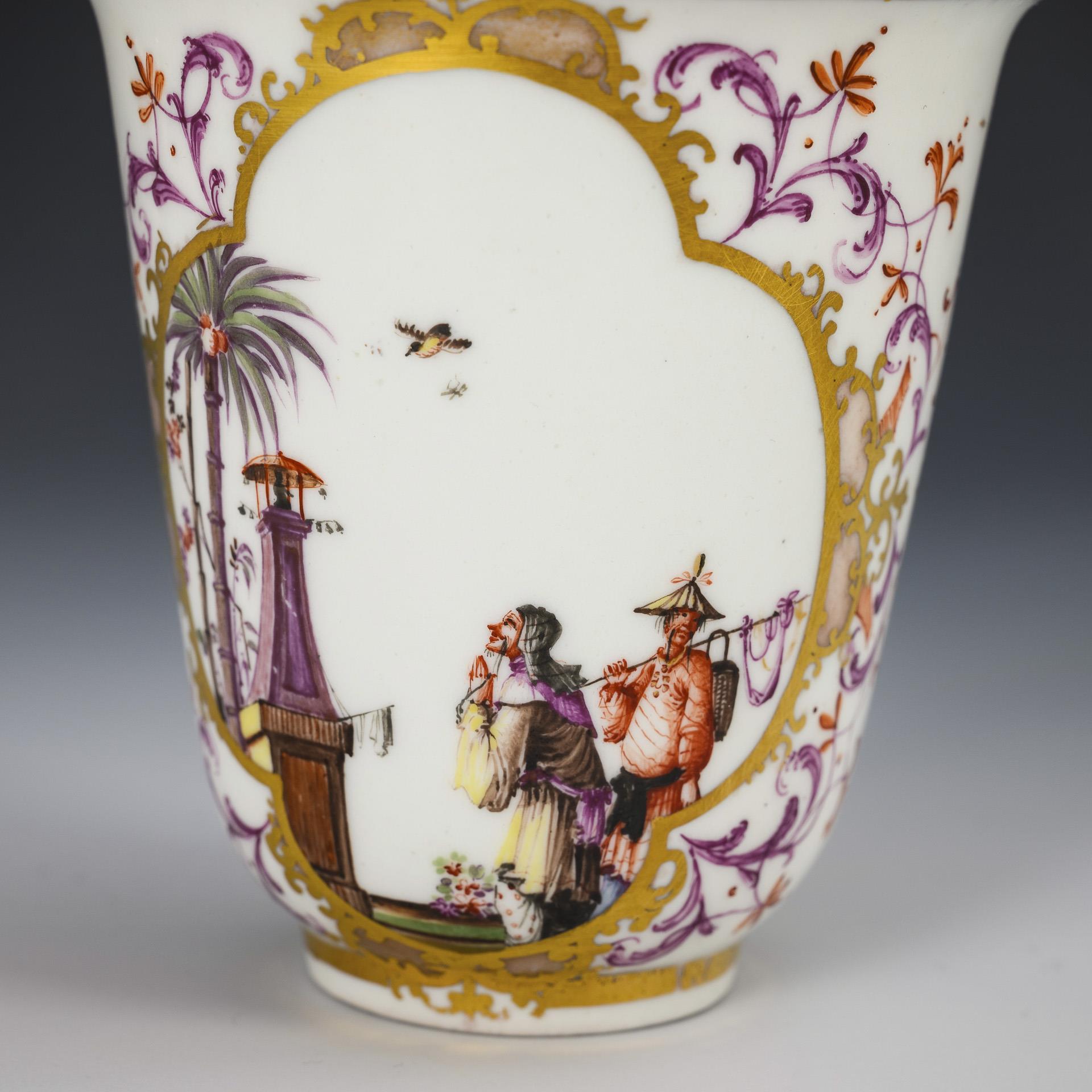 Bell-shaped cup with saucer. On both sides and in the mirror of the saucer a large quatrefoil cartouche framed by gold rocailles with Asian figure motifs. Chip to the rim of the cup, 3 slightly ground chips to the rim of the saucer.