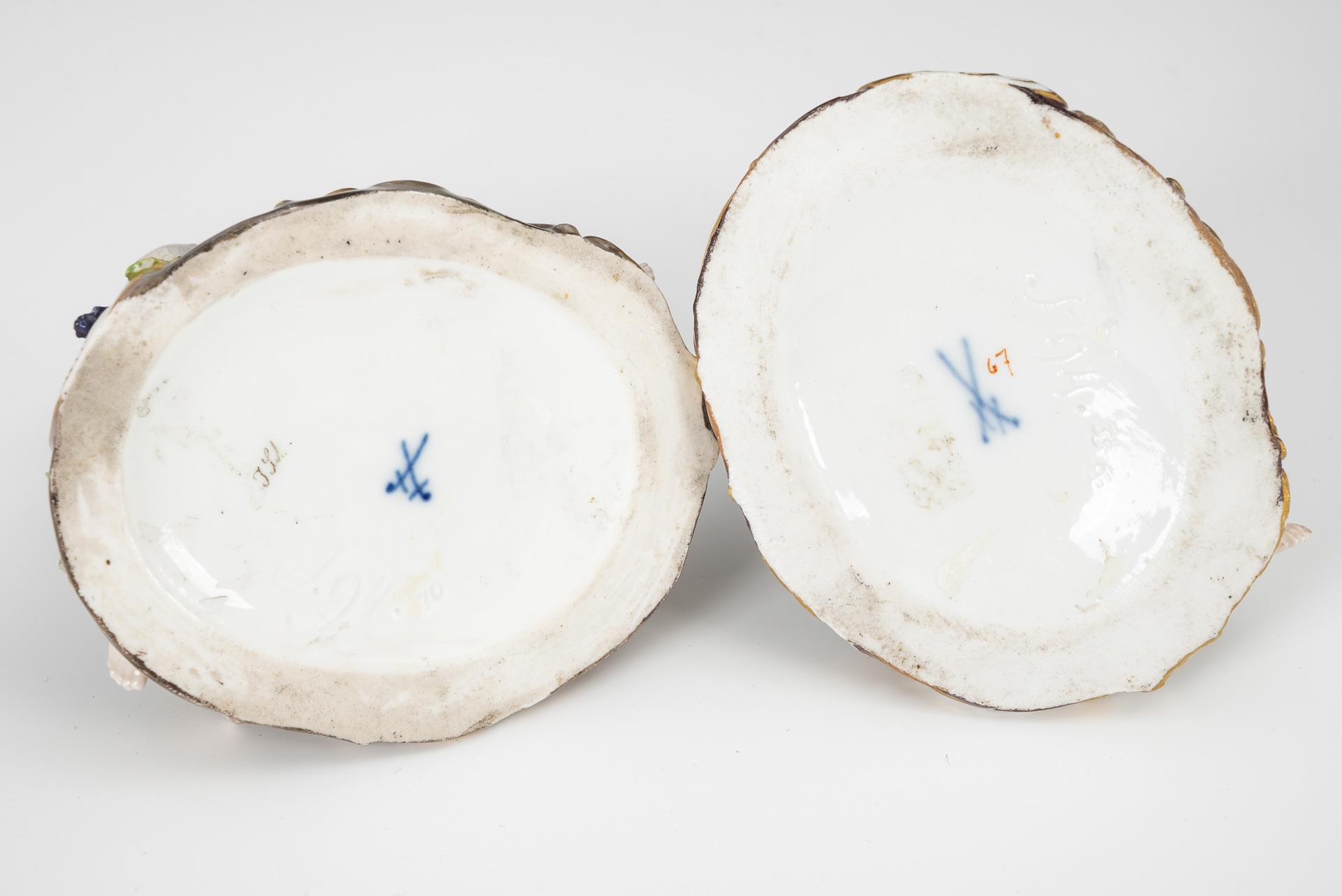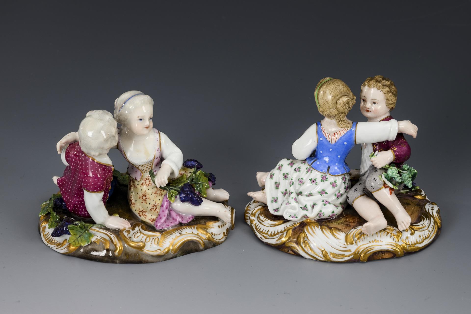 A pair of children with grapes resting on a rocaille base. 1 boy's leg and 2 heads restored, partially chipped leaves and grapes.