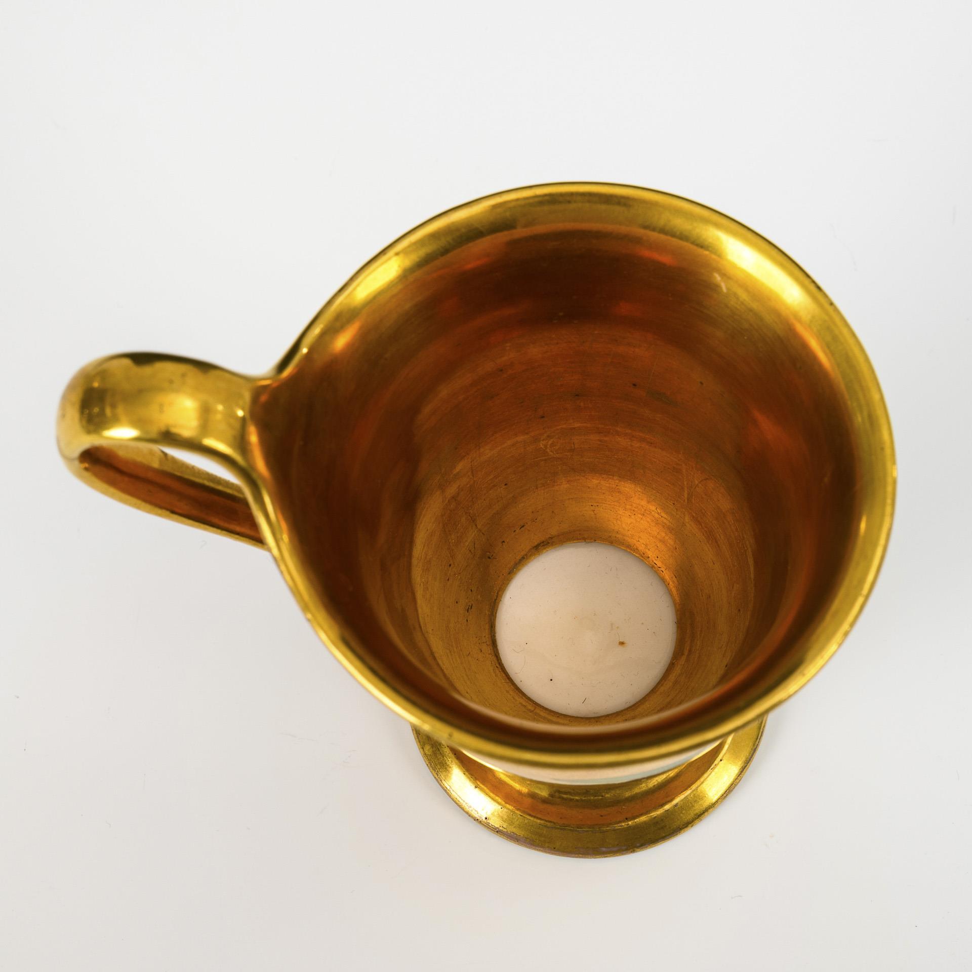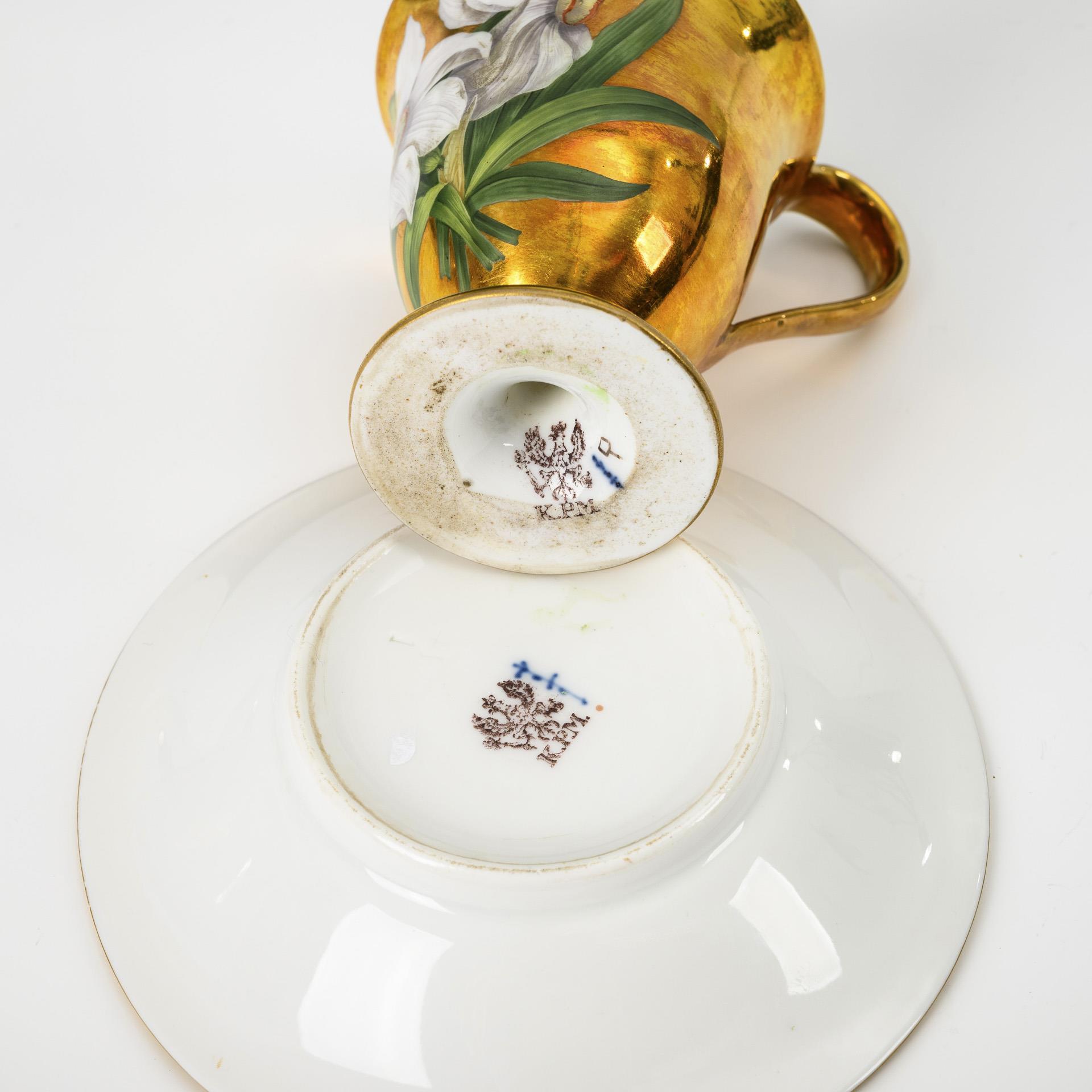 Polychrome painted, decorated in gold. Cup (h 10.5 cm), original saucer (13.5 cm).