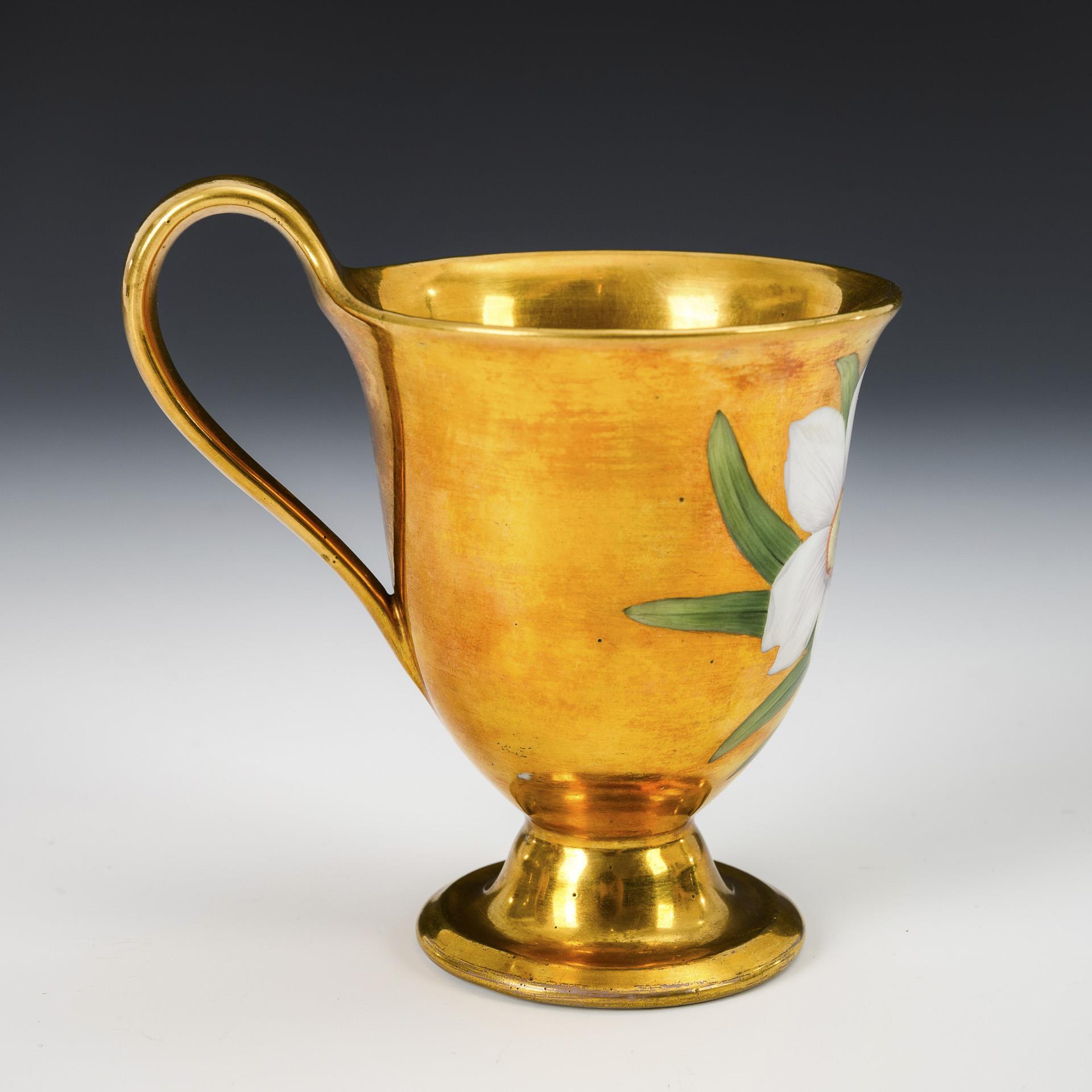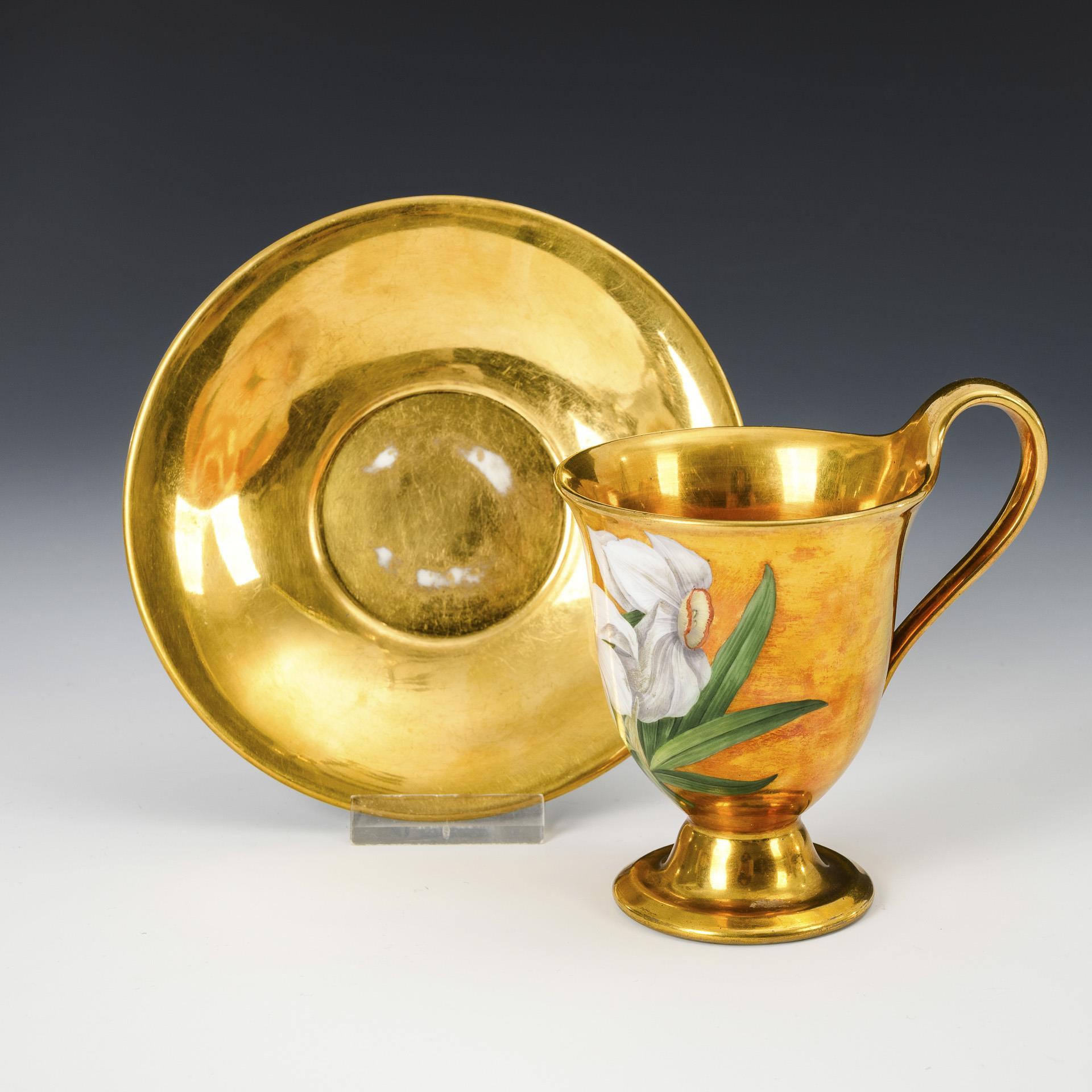 Footed bell-shaped cup with campanile handle. Gold ground, on the front the depiction of two daffodils. Minimal gold abrasion to the saucer rim.
