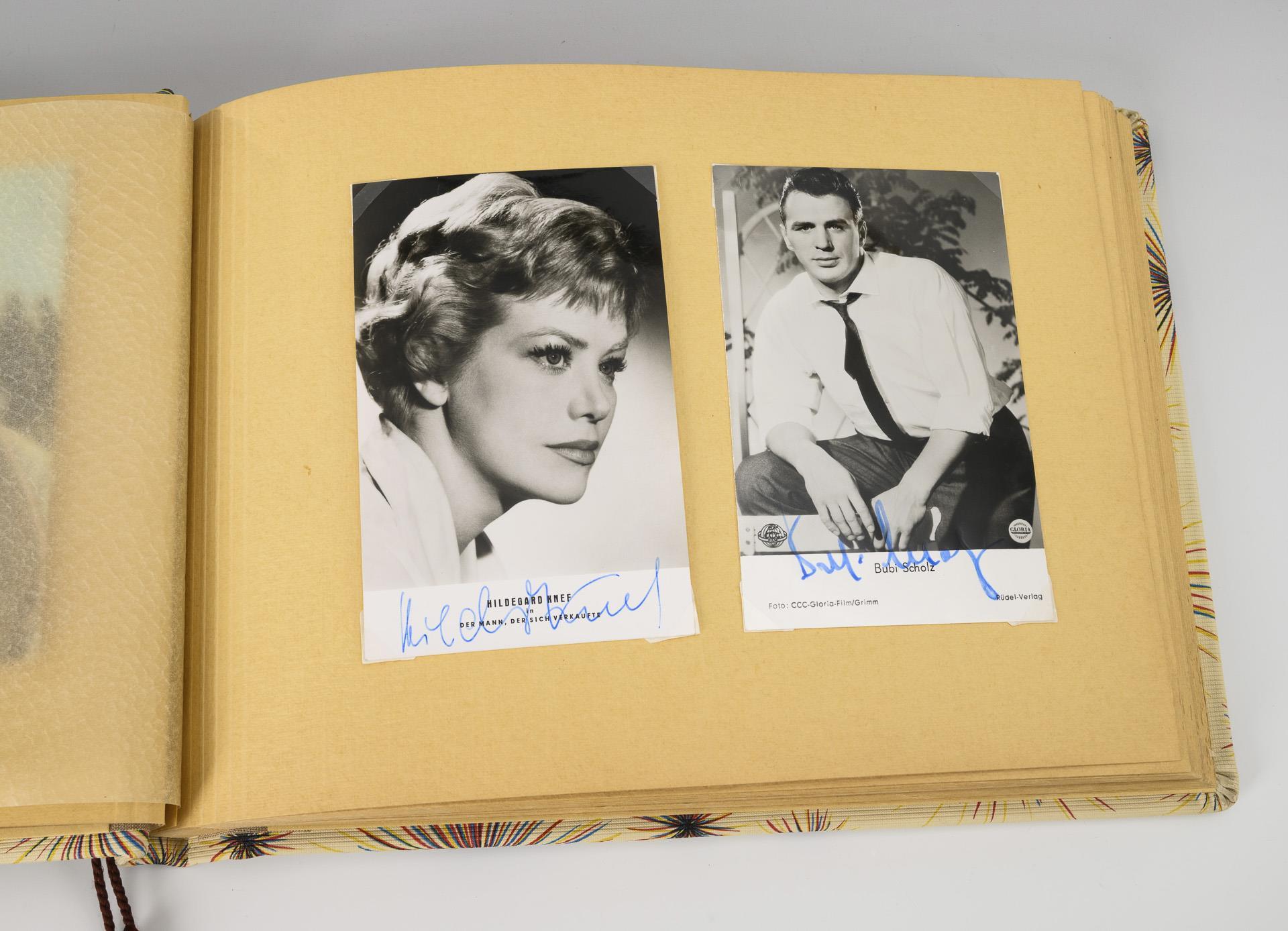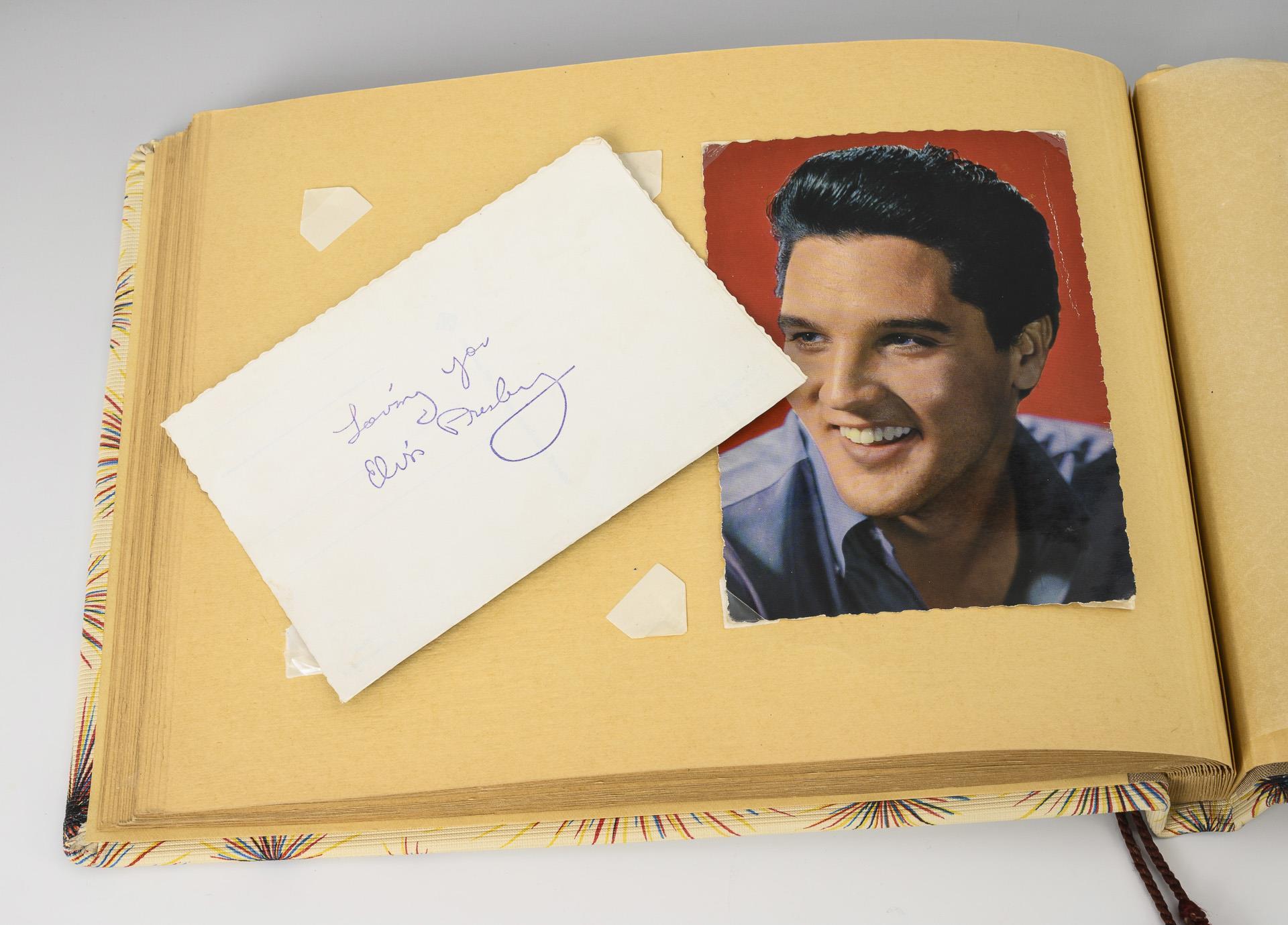 Autograph cards of singers and actors, e.g. Elvis (offset prints, 1x printed dedication laminated on the reverse), Peter Kraus, Peter Alexander, Hildegard Knef, Udo Jürgens, Hardy Krüger etc. in beige album with radiating decor.