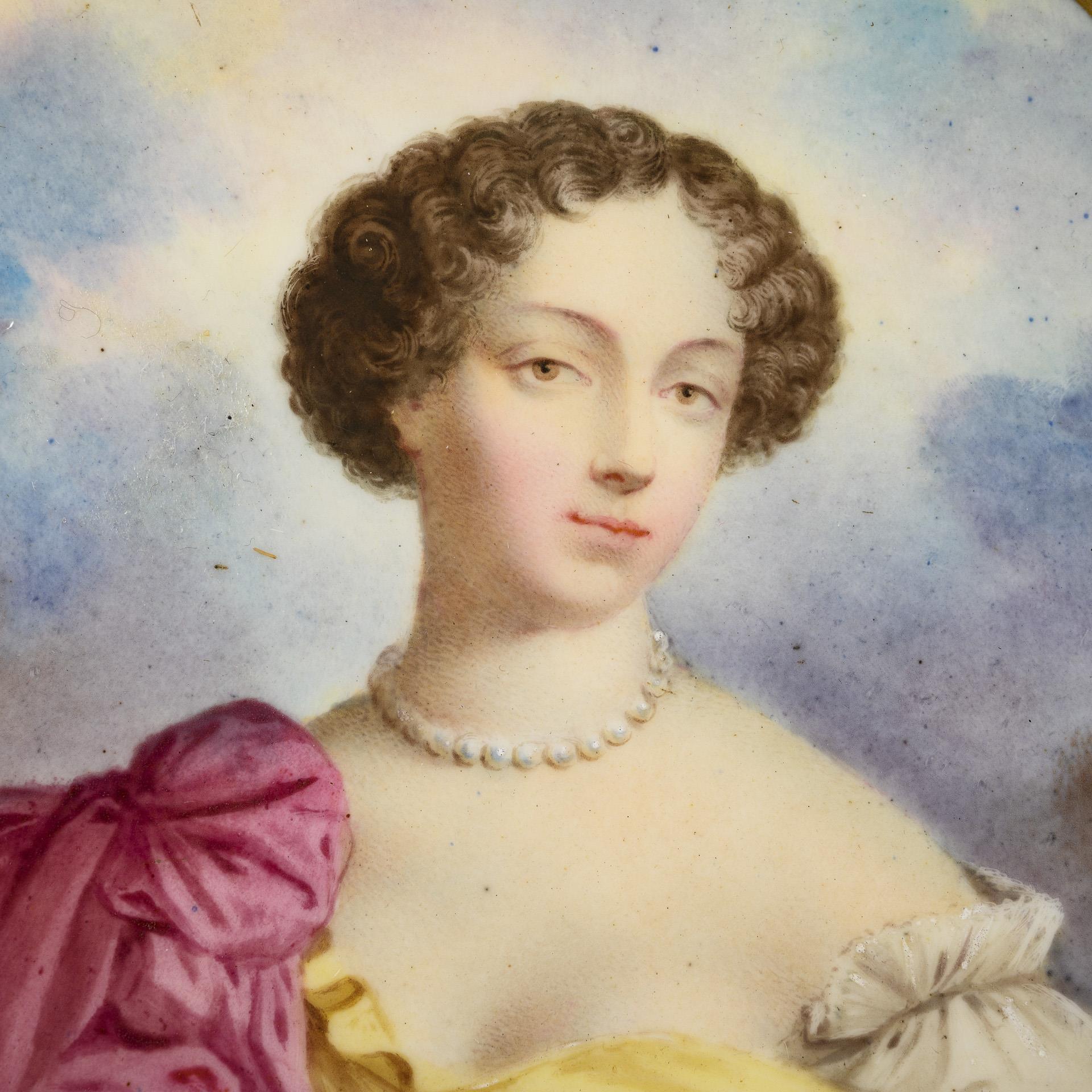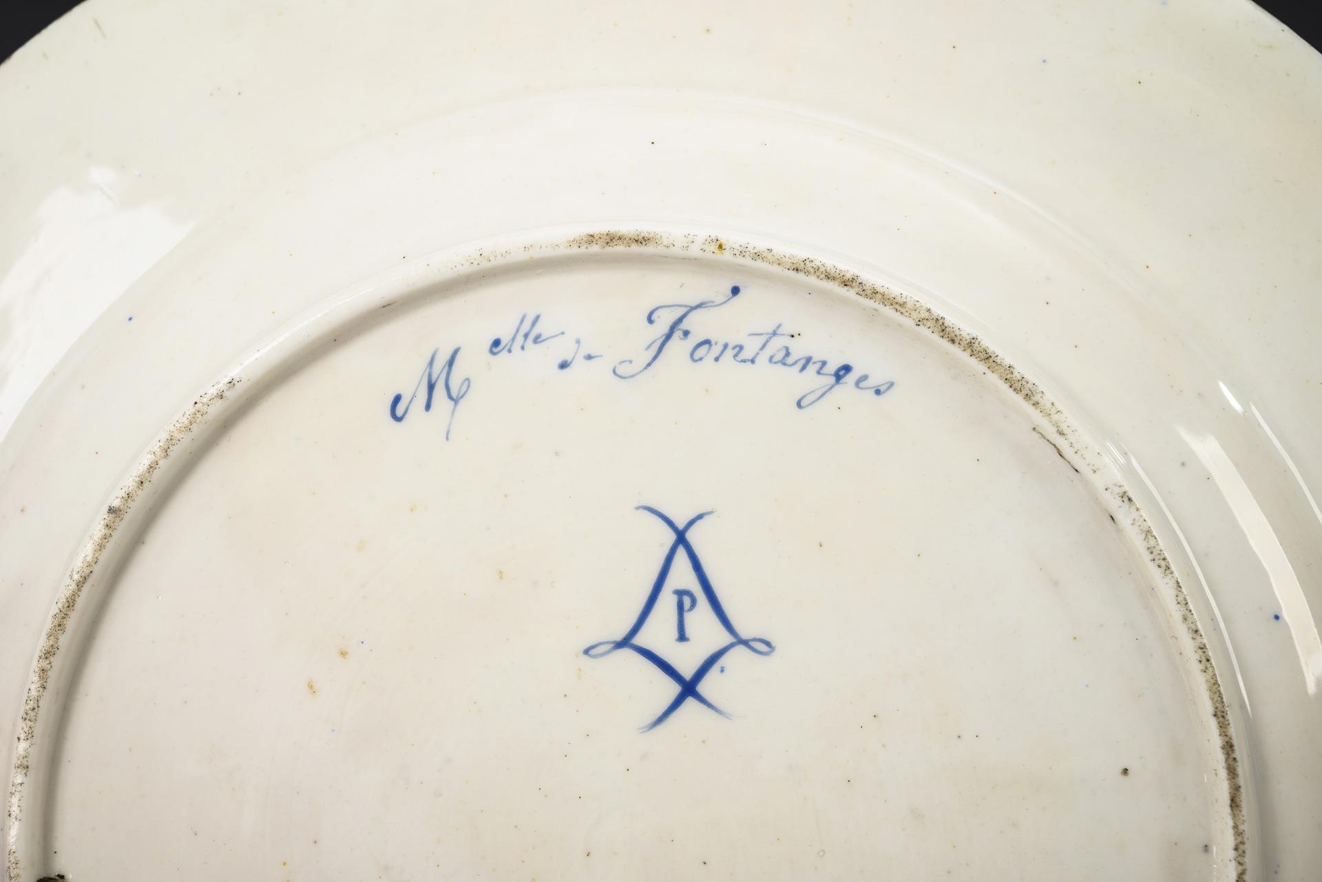 Fitted plate with floral, gold-engraved painting on the cobalt blue rim, in the mirror a medallion with the portrait of Marie Angélique de Scoraille de Roussille, Mademoiselle de Fontanges (1661-1681), a mistress of King Louis IX, inscribed on the verso.