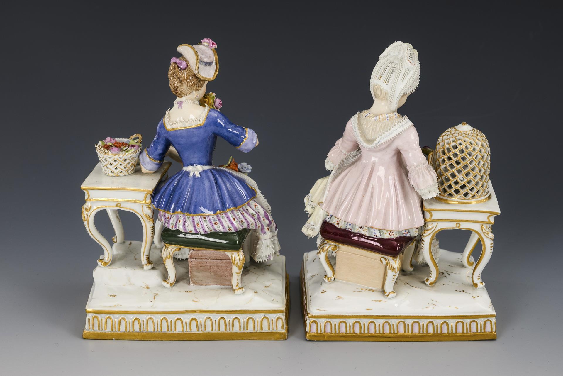 1x "The Feeling", model no. E 4: Rococo lady sitting at a table with birdcage / 1x "The Smell", model no. E 5: Rococo lady sitting at a table with flower basket and smelling bottle. The Feeling: knob of the cage missing; The Smell: hat restored, 1 flower and 1 leaf bumped; tip of both minimally bumped.