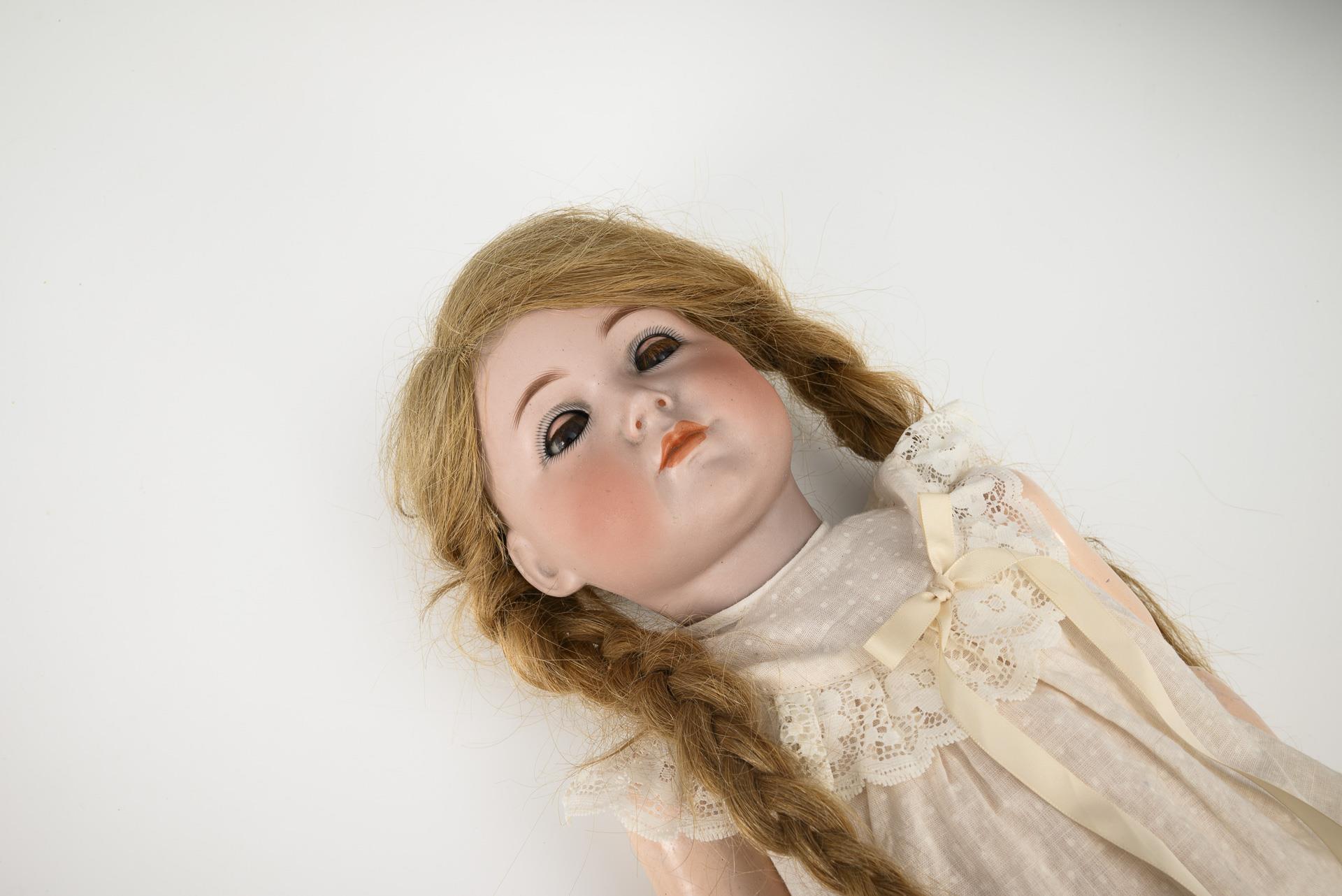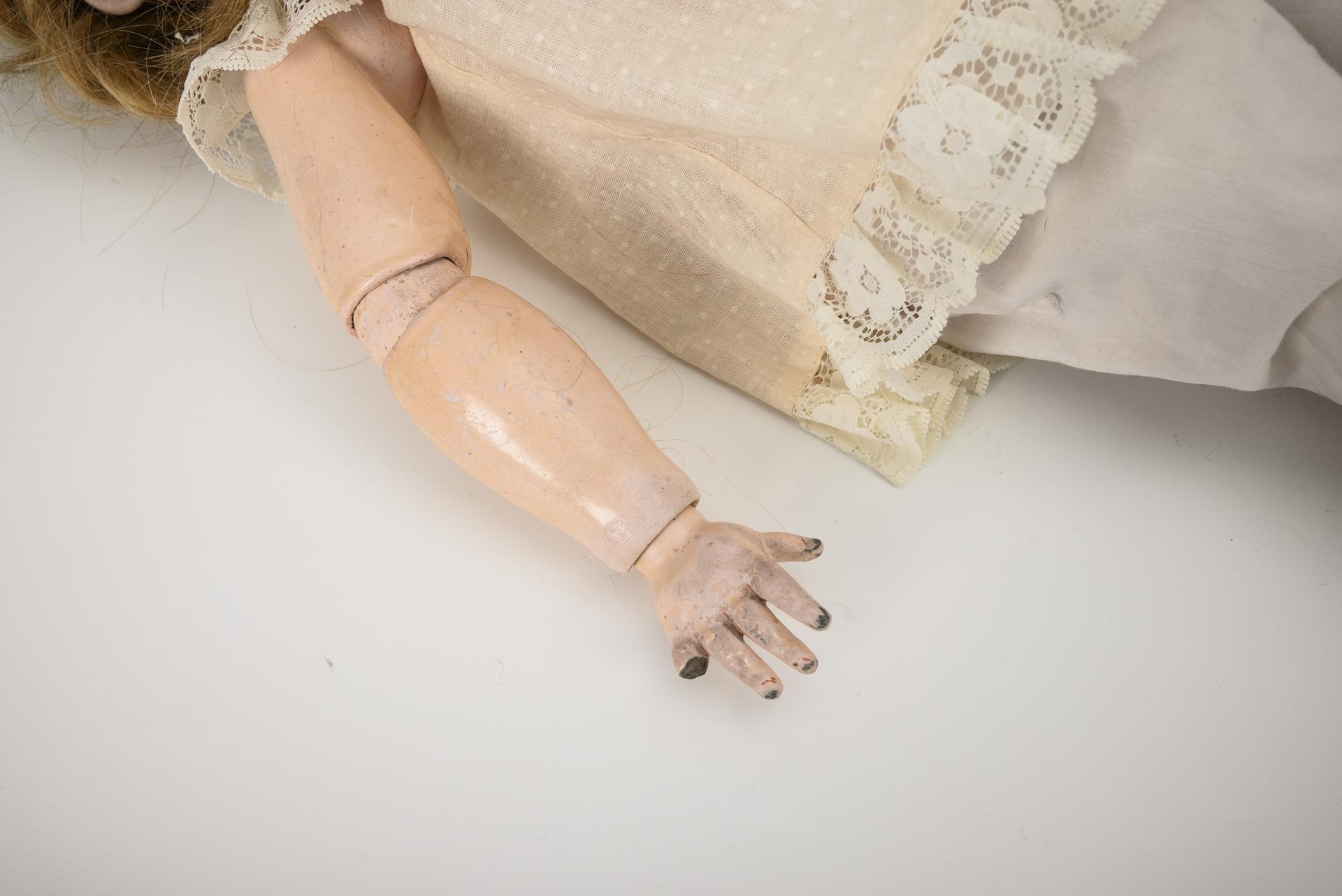 Cranked head, brown sleeping eyes, eyelashes, blond real hair with braided tresses. 15-piece articulated body. In white underwear and knitted stockings. Percussion fixed: head not x-rayed. Little finger on the right is missing.