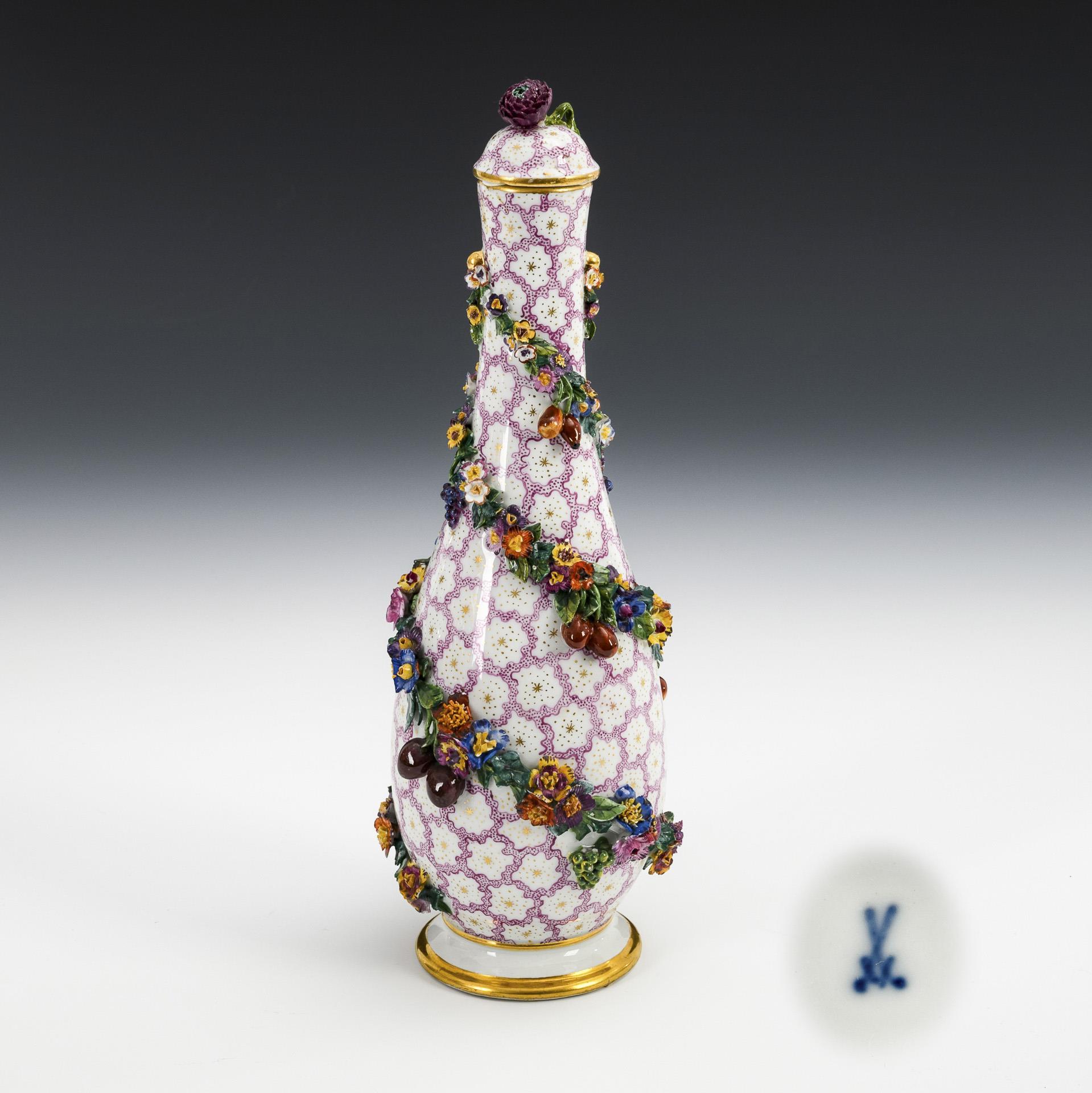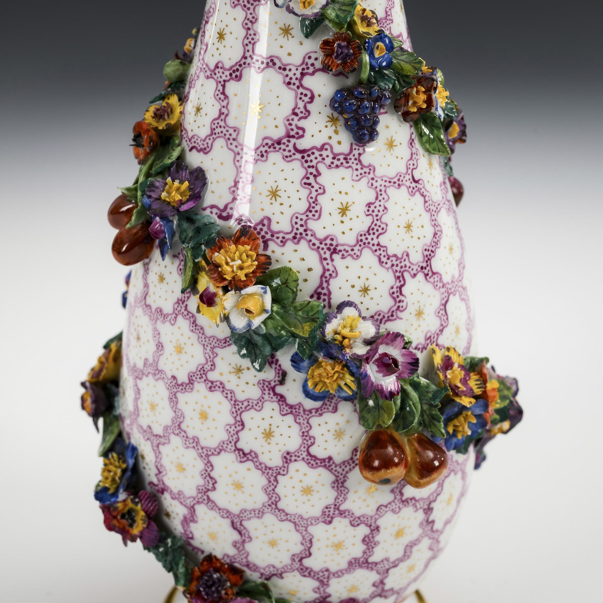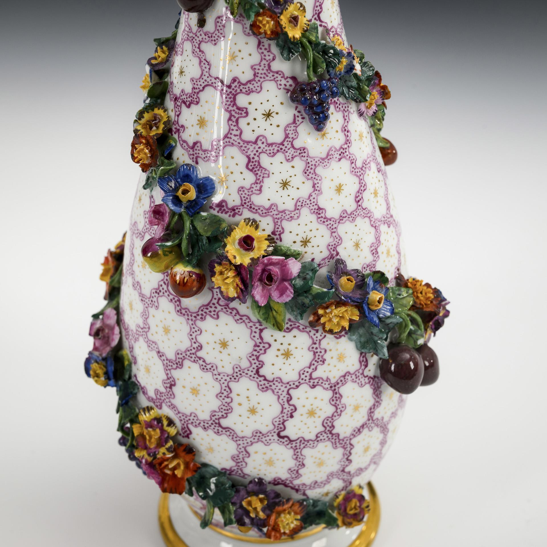 Slim pear vase with flower knob cover and a fruit and flower garland applied spirally to the wall. Bumps to the lining, knob restored.