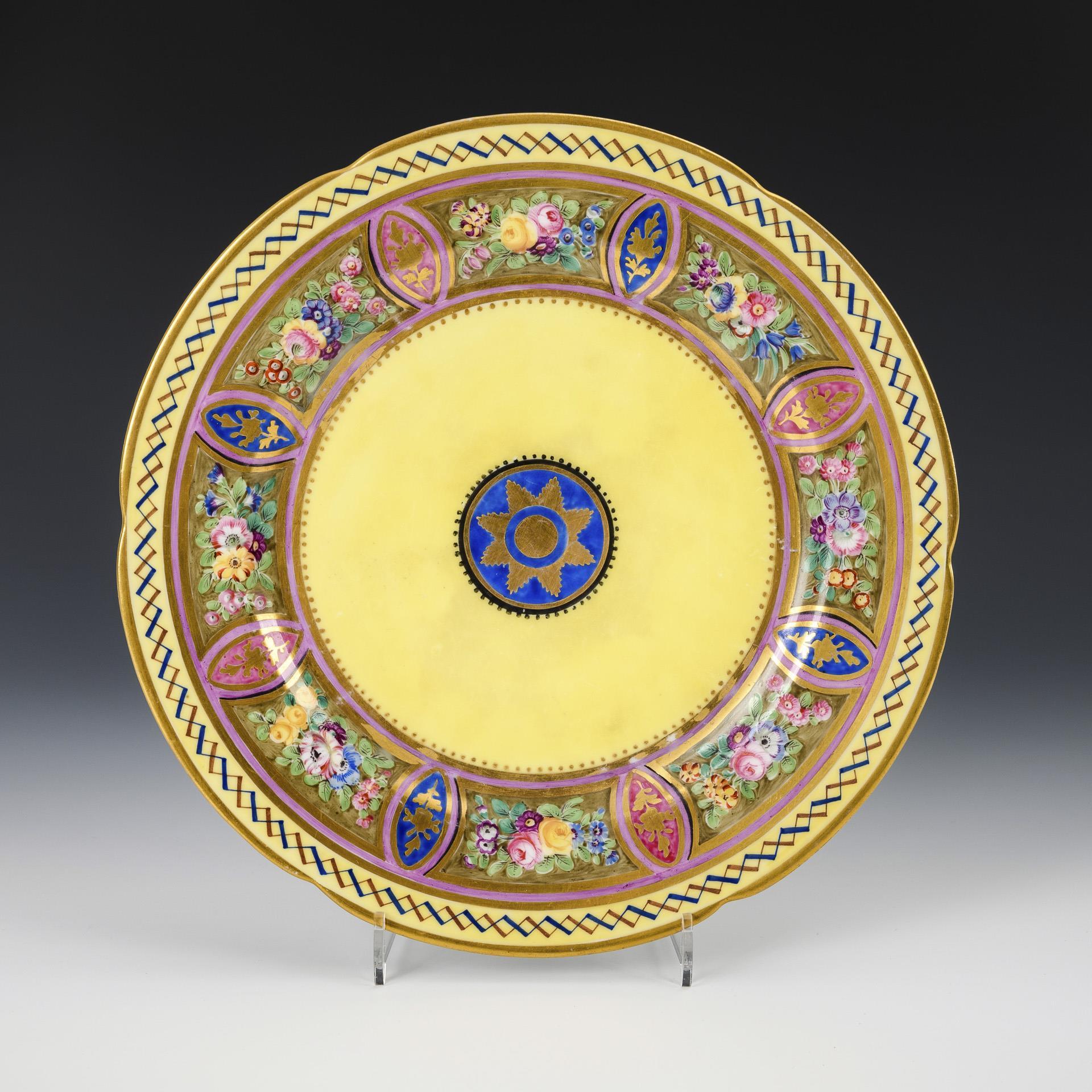 Multi-pass plate. Lemon yellow, pink, blue and brown partial background. On the rim cartouches with flower painting, in the mirror a rosette in blue, gold and black. Scratch marks in the mirror.