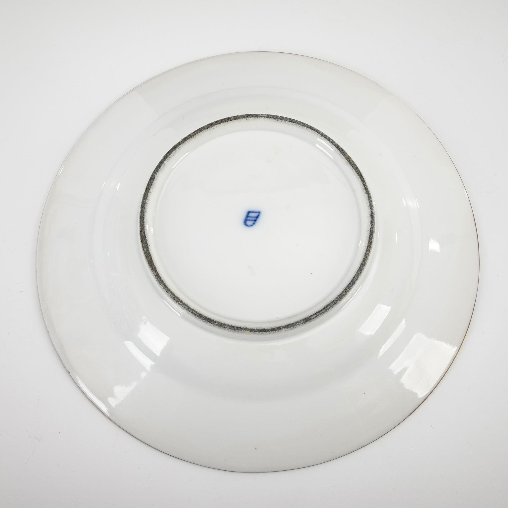 Pompous plate with cobalt blue and rust-red partial ground, rich relief gold grotesque painting, white enamel painting and jewel painting; in the mirror the depiction of Venus with lovers, in the background two doves.
