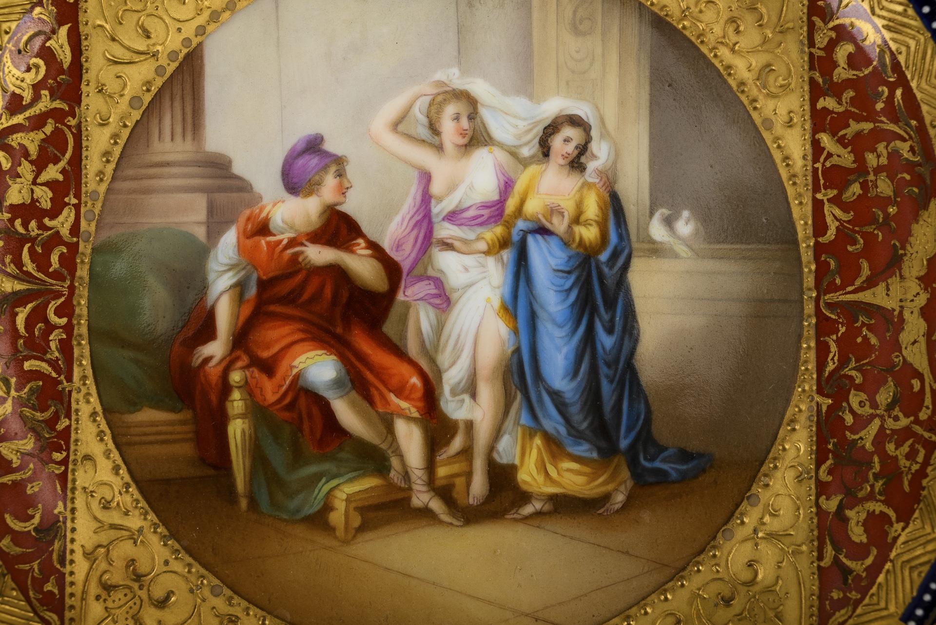 Pompous plate with cobalt blue and rust-red partial ground, rich relief gold grotesque painting, white enamel painting and jewel painting; in the mirror the depiction of Venus with lovers, in the background two doves.