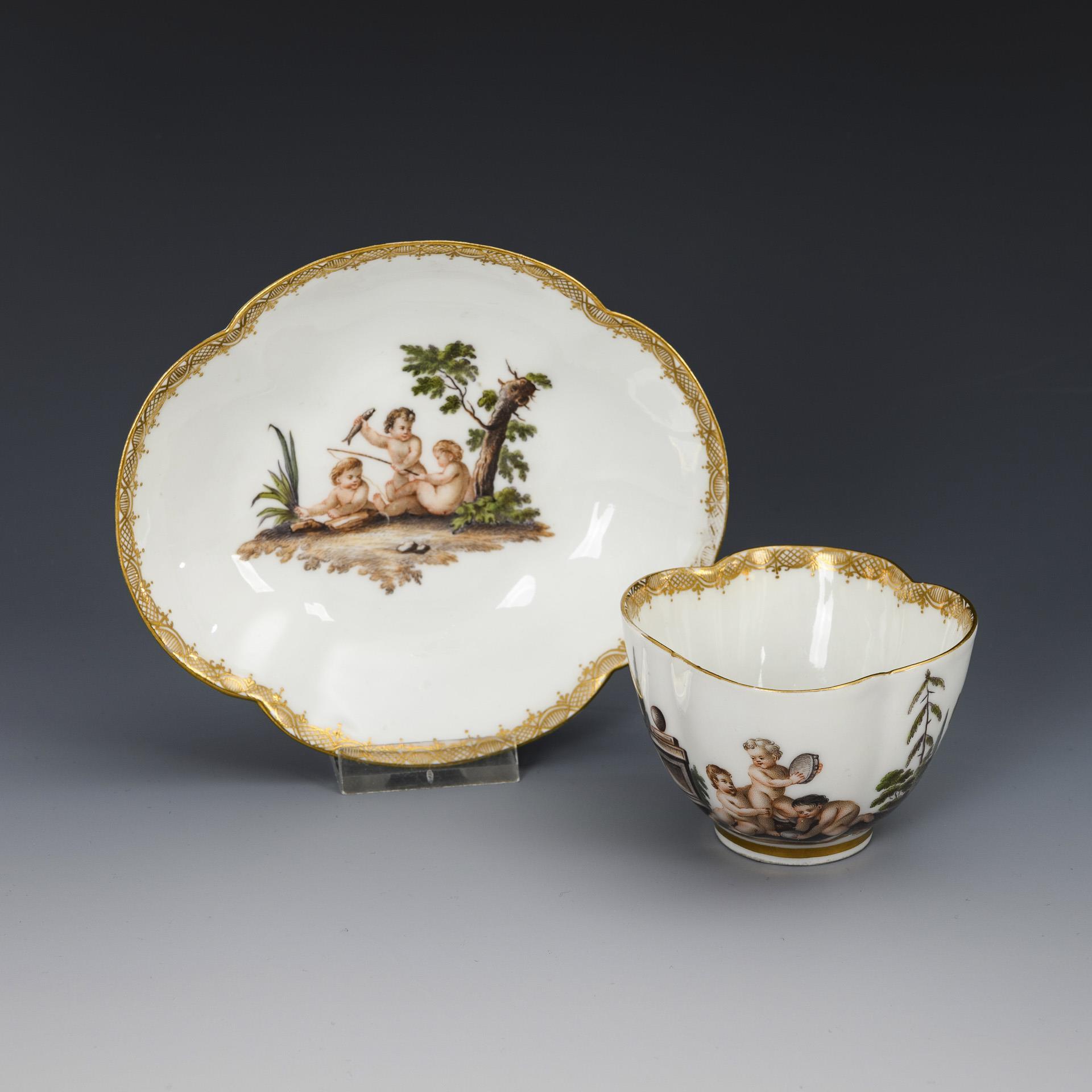 Quatrefoil cup with tapering handle. The front depicts a landscape island with three putti, 1x with tambourine and 1x with fishing rod and fish. Bump to the base ring of the cup and minimal bumping to the base ring of the saucer.