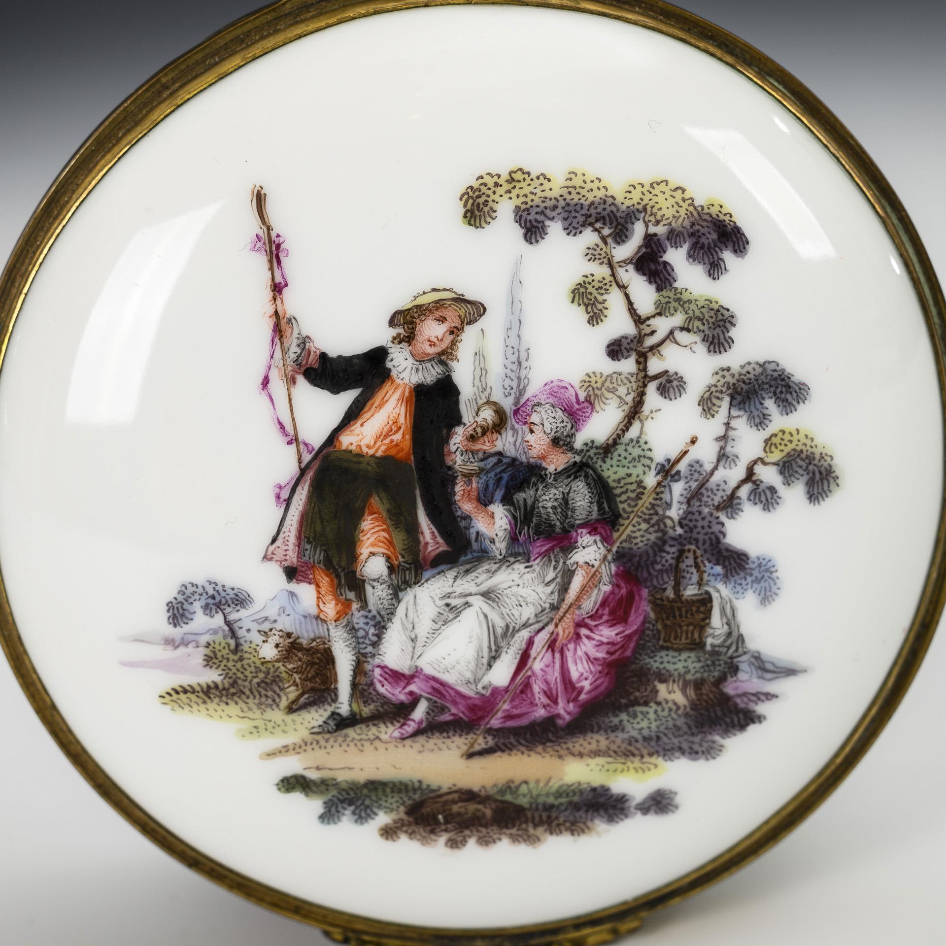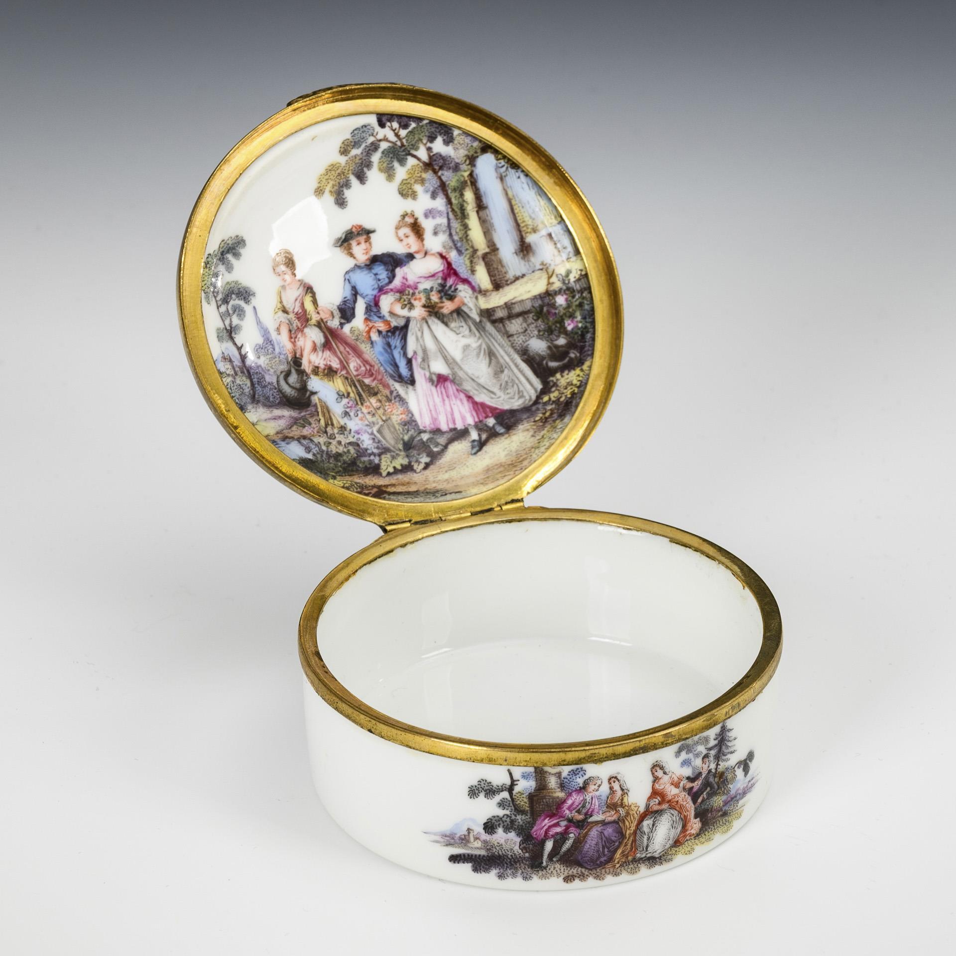 Round box with metal-mounted hinged lid. Painted on all sides with gallant couples in a park landscape.