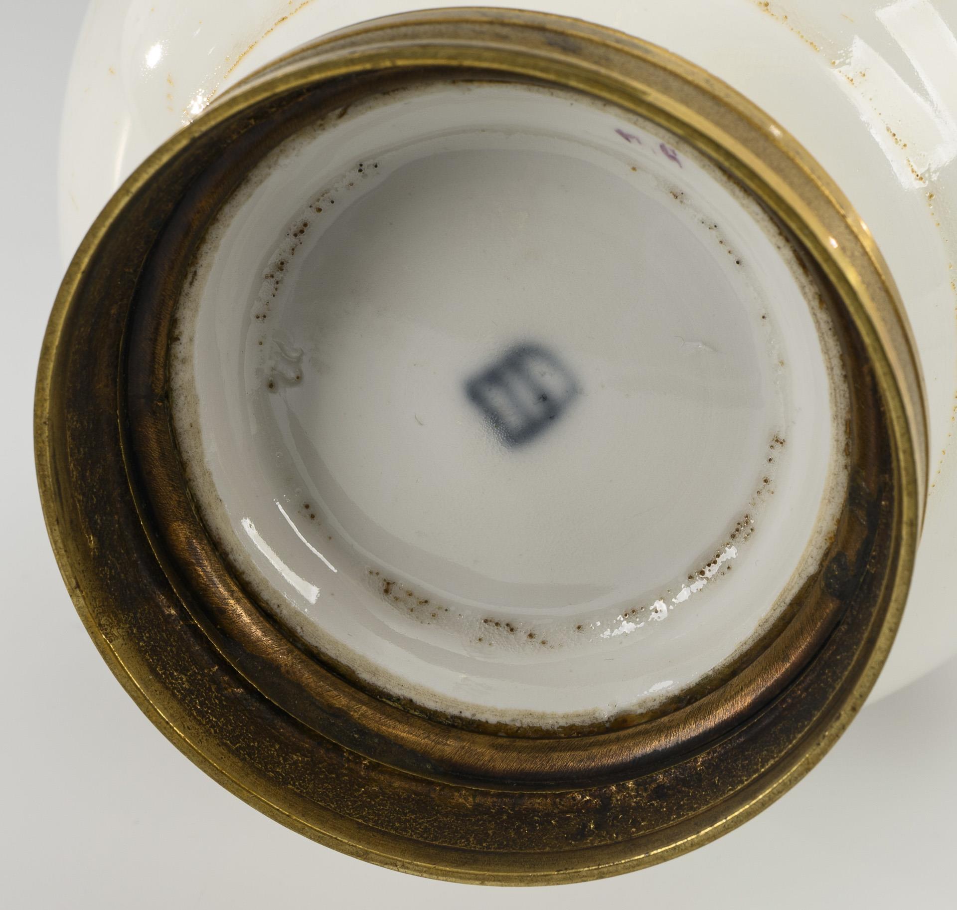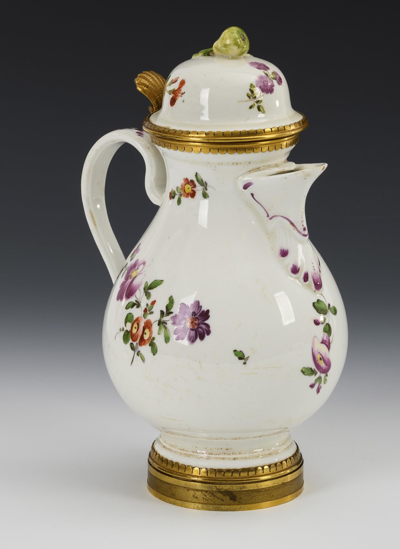 Pear jug with bronze-mounted stand and pear knob lid with shell pusher. Minimal chip to the snout and to the inside of the lid rim.