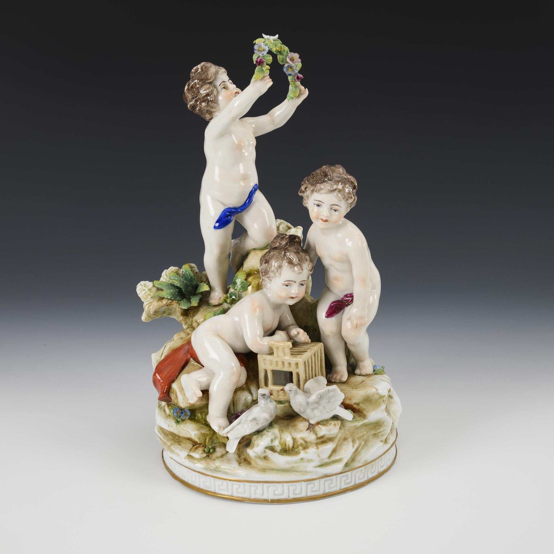 Three cupids grouped on a rock base with doves, birdcage and garland. 1 dove wing and partially bumped flowers and leaves.