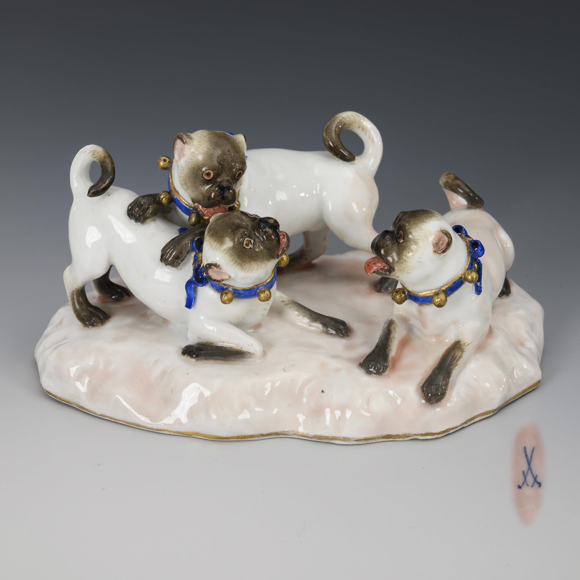 Three pug dogs playing with each other on a natural base. Base, collars, 1 pug body and 3 pug tails restored.