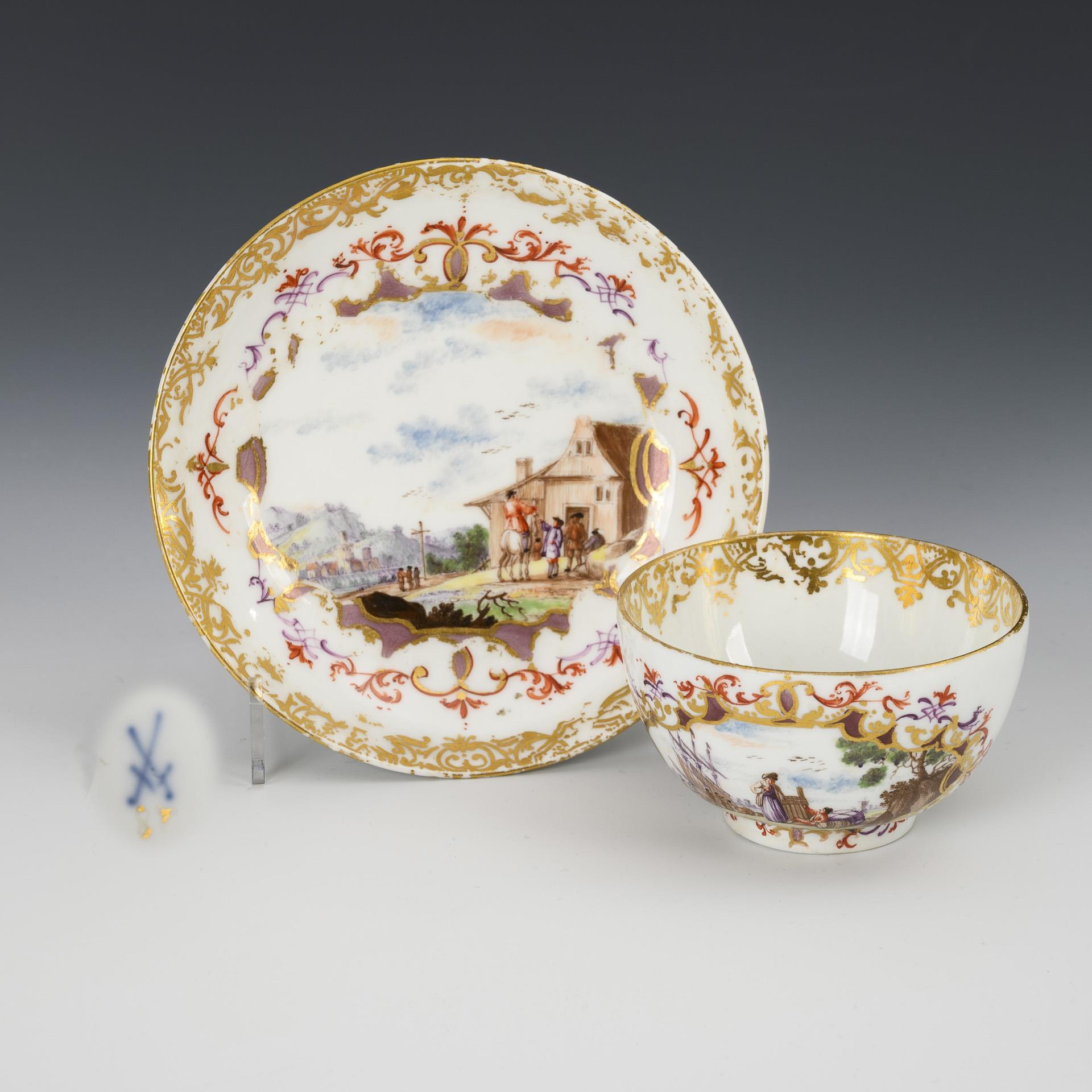 A gold rocaille-framed cartouche on both sides and in the mirror of the saucer, depicting coastal landscapes with ships, merchants and goods on the cup, a landscape with an inn, figures and riders on the saucer. Restoration to the cup stand ring, the saucer rubbed.