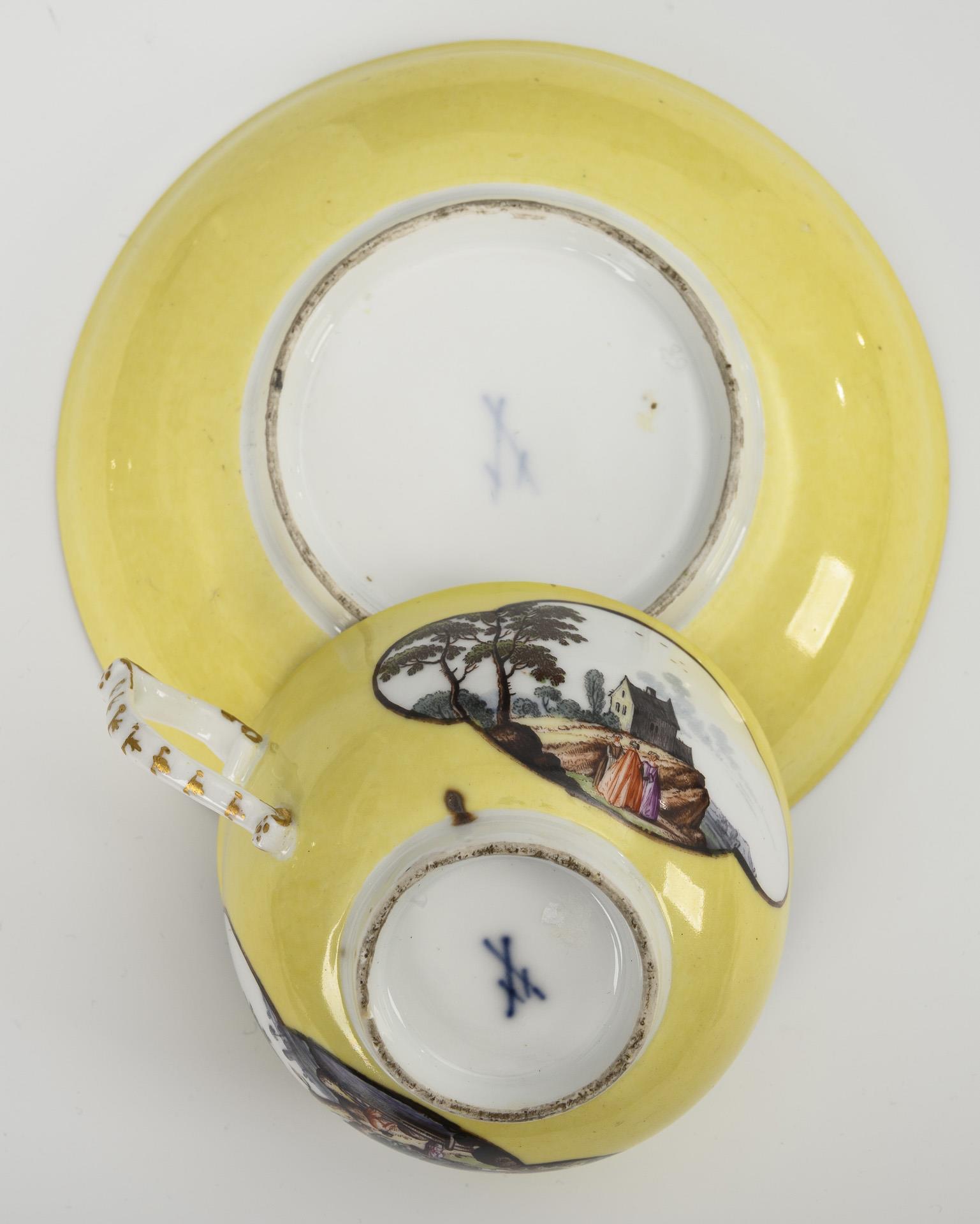 Bellied cup with rocaille handle. Lemon yellow ground, quatrefoil cartouches on both sides, depicting landscapes with figural staffage. Minimal gold abrasion, cup with restored rim and restored wall hairline crack.