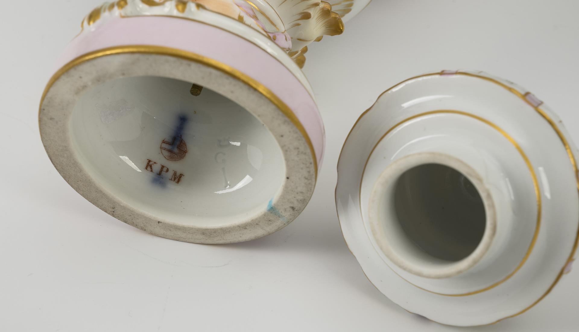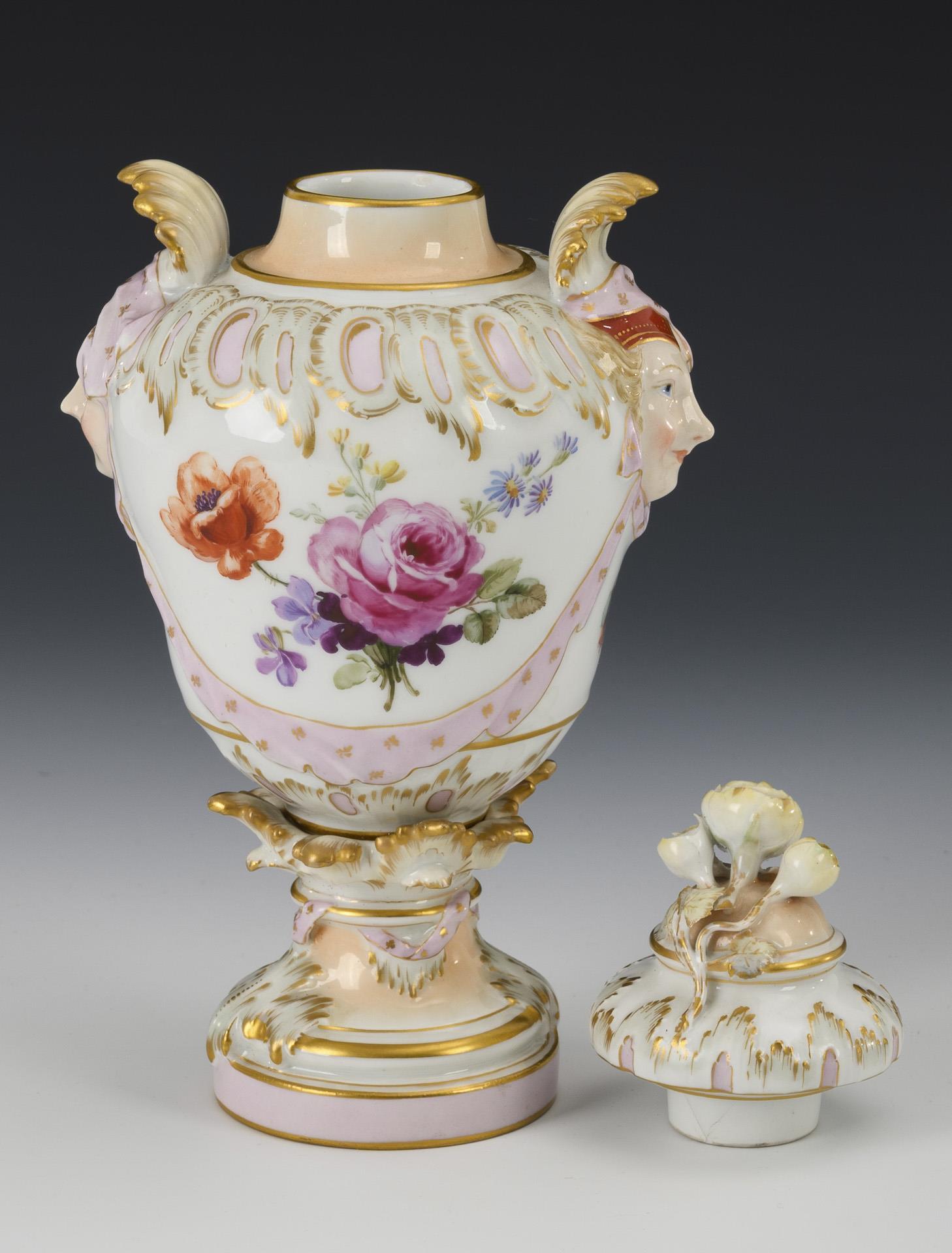 Baluster body with two female head handles, floral finial cover and round base. The depiction of a flower bouquet on both sides. The inner rim of the lid and flower pommel chipped.