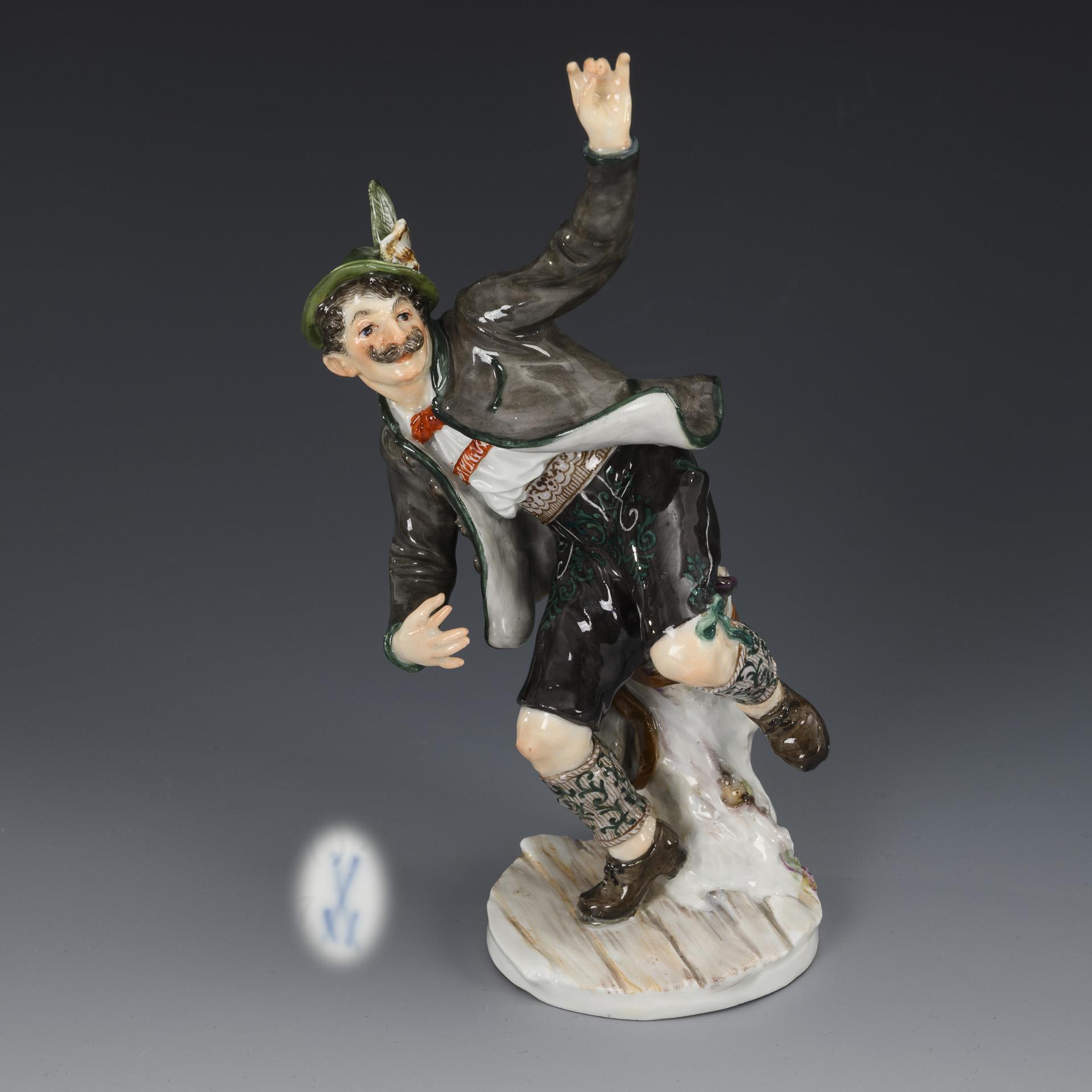 Peasant in traditional costume dancing a Schuplattler standing on a plank base. Fingers of the left hand and hat partially restored.