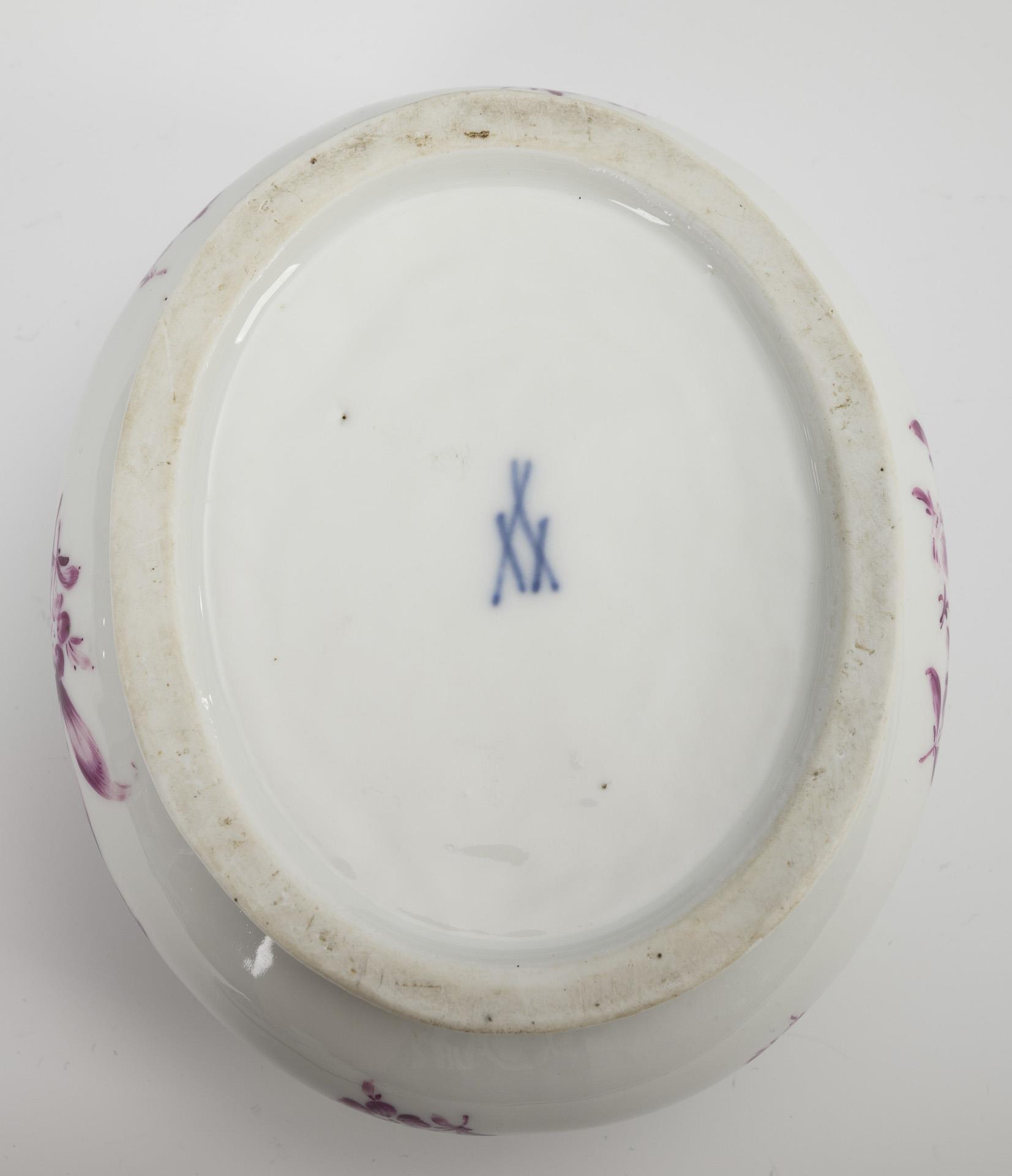 Oval box with rabbit knob lid and purple flower painting. Rim ground.
