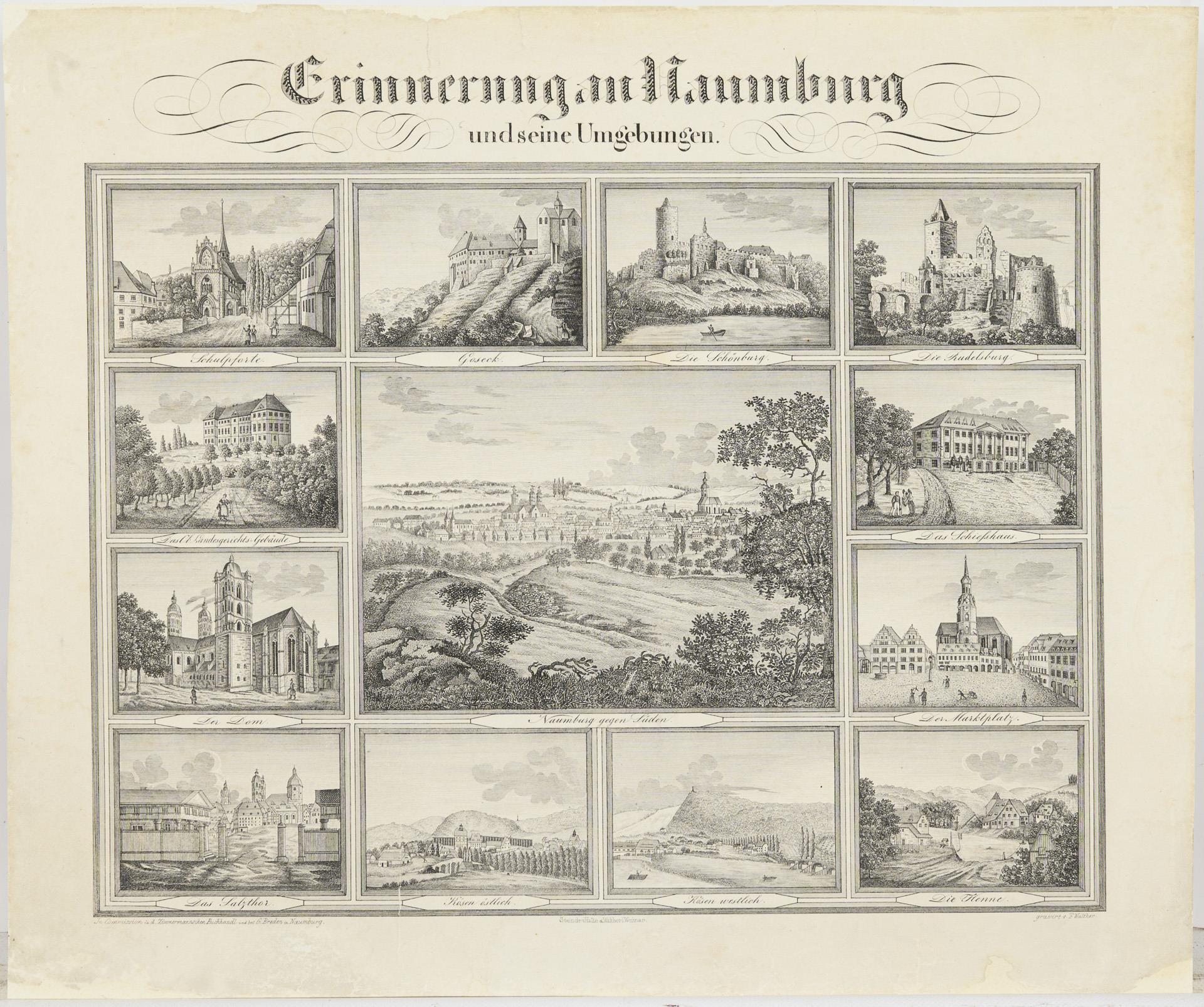 "Memories of Naumburg and its surroundings", 13 views on one sheet, engraved F. Walther. Expertly restored and duplicated.