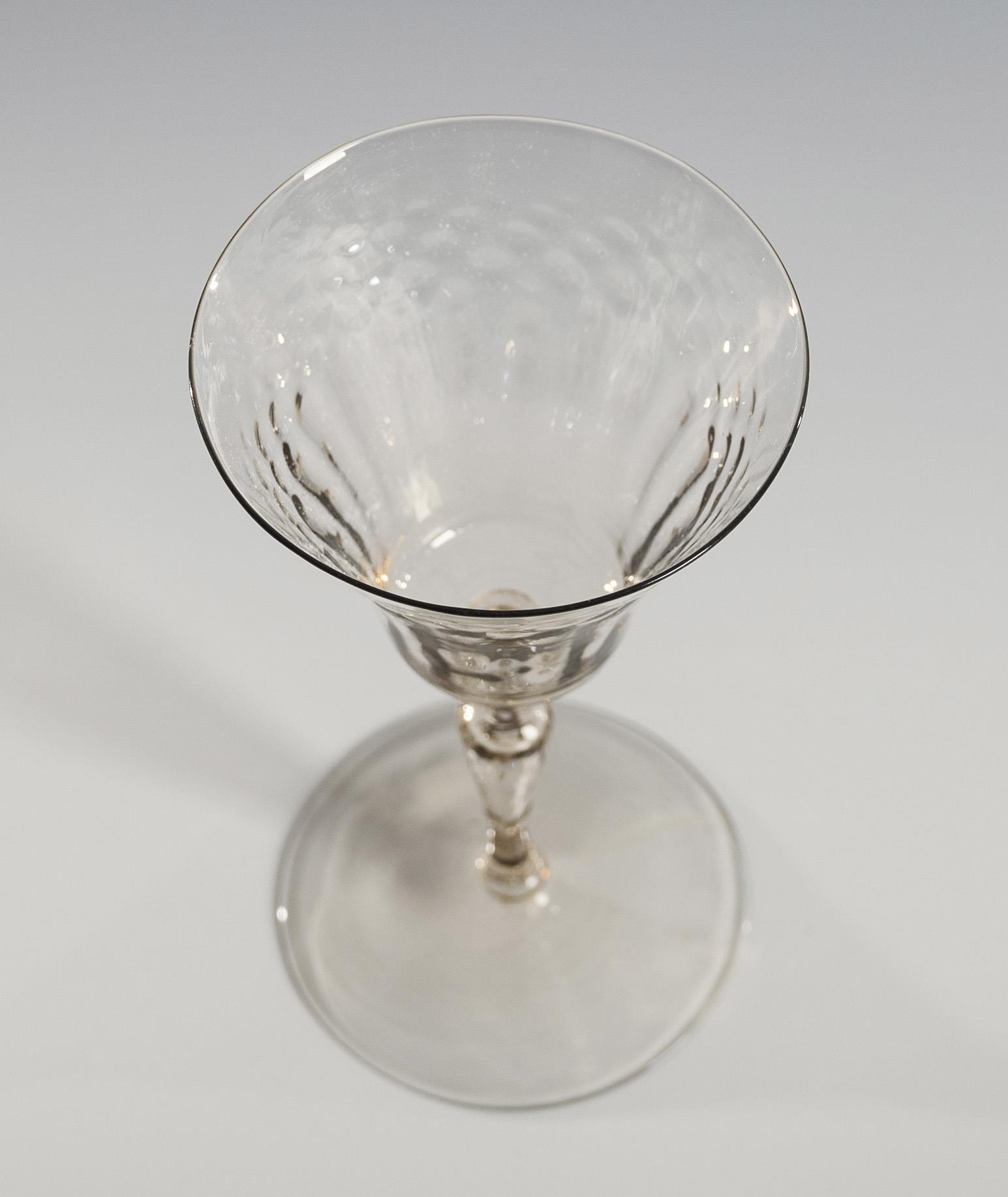 Bell-shaped cuppa with optical honeycomb and ribbed pattern, slender, longitudinally optically blown hollow baluster stem, round foot; pontil mark.
