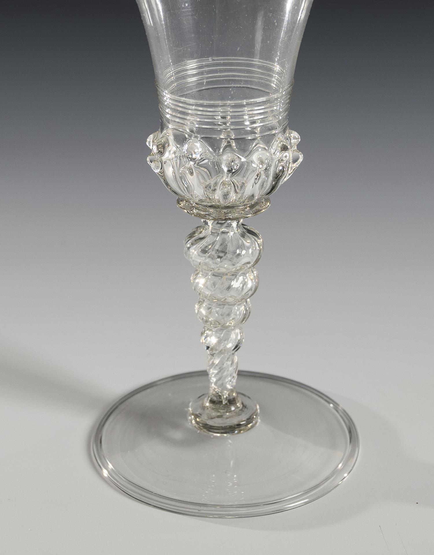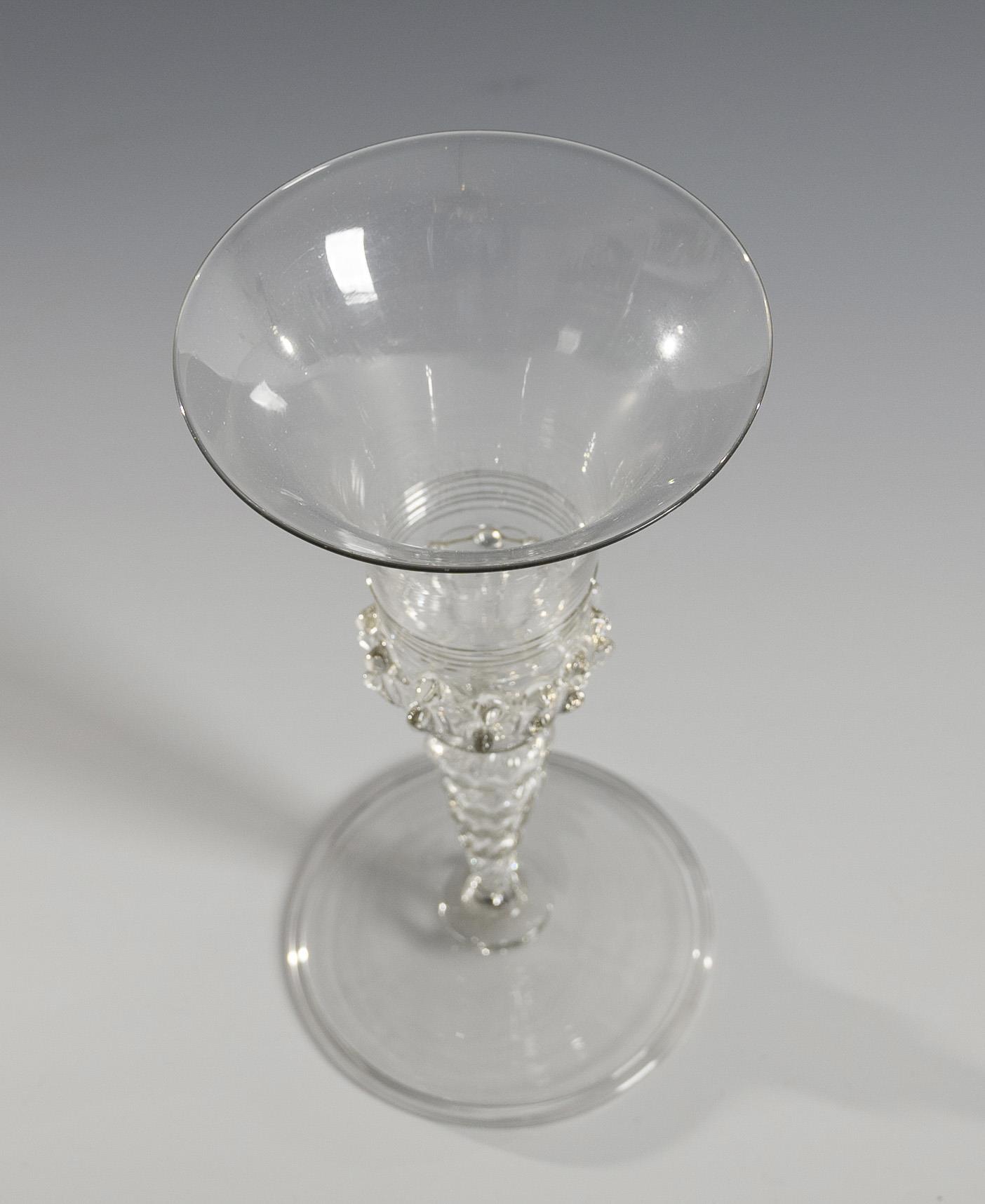 Cratered bowl with applied thread spiral and molded rib and drop decoration at the base, multi-jointed, angled shaft, round foot with turned rim; small pontil mark.