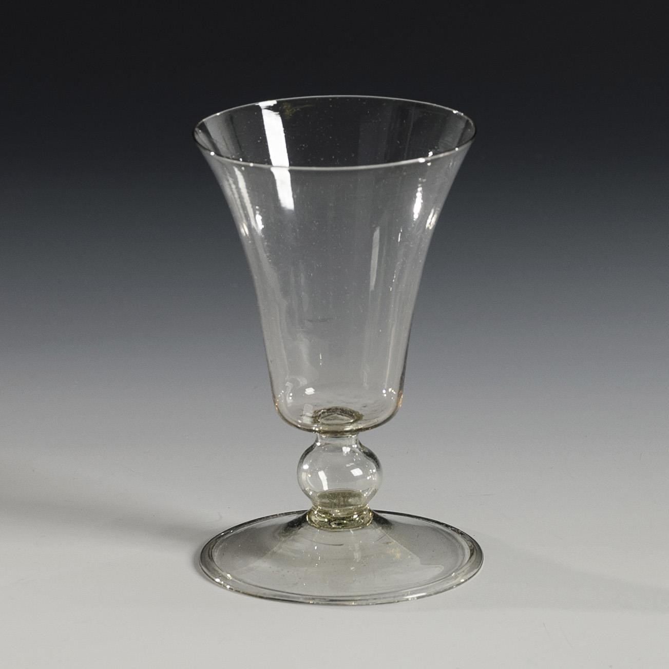 Bell-shaped cup, small hollow baluster stem, round foot; with narrow folded rim; pontil mark.
