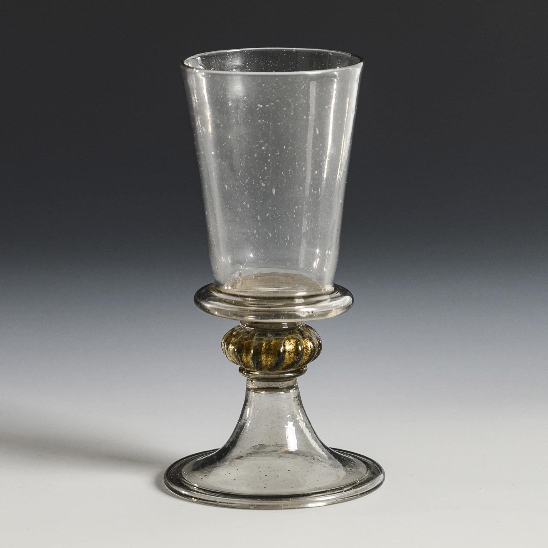 Conical bowl with surrounding hollow rim at the base, pressed and ribbed ball finial with blasted gold foil overlay, trumpet foot with everted rim; pontil mark.
