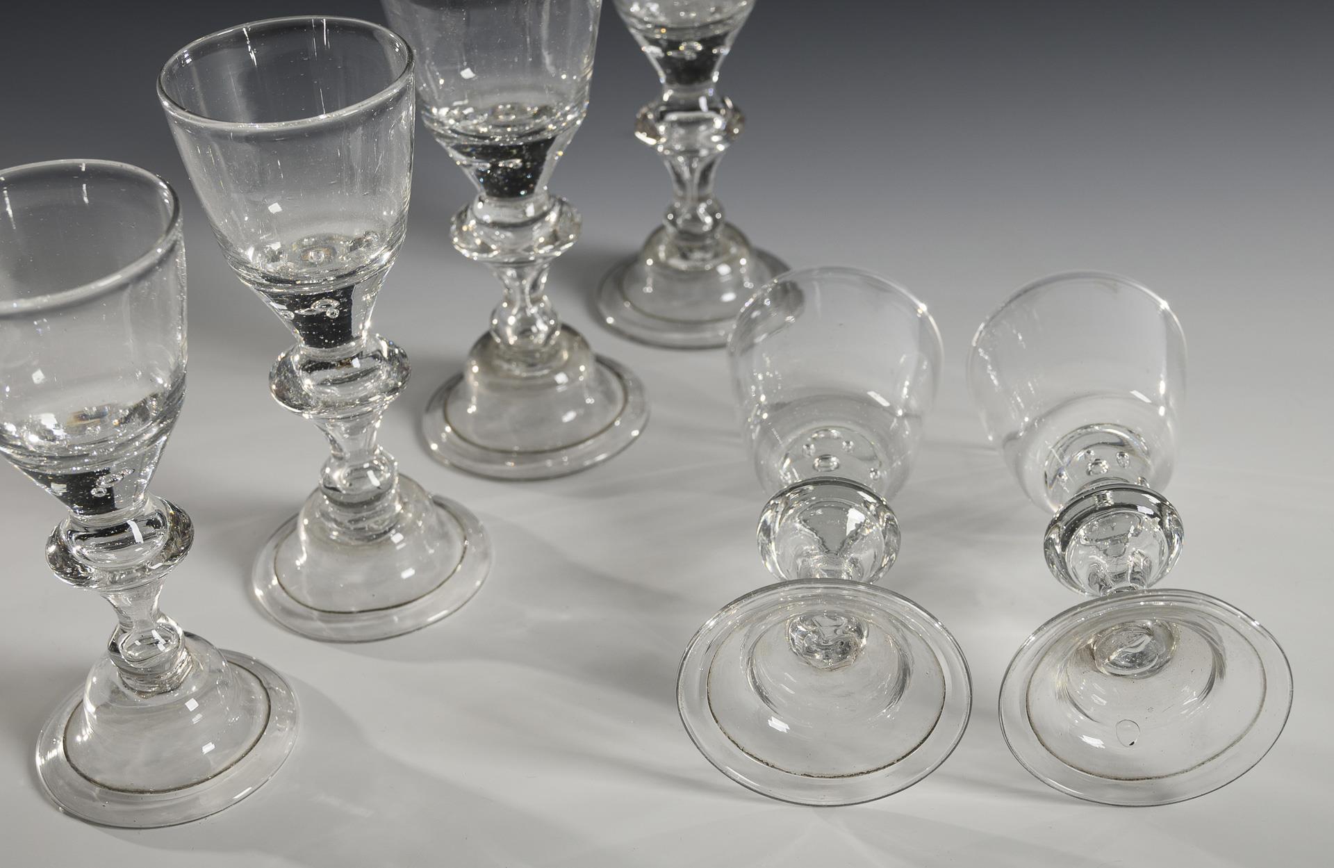 Conical bowl with seven pierced air bubbles in the solid bowl base, baluster stem with pierced air bubble, hat foot with folded rim; pontil mark.