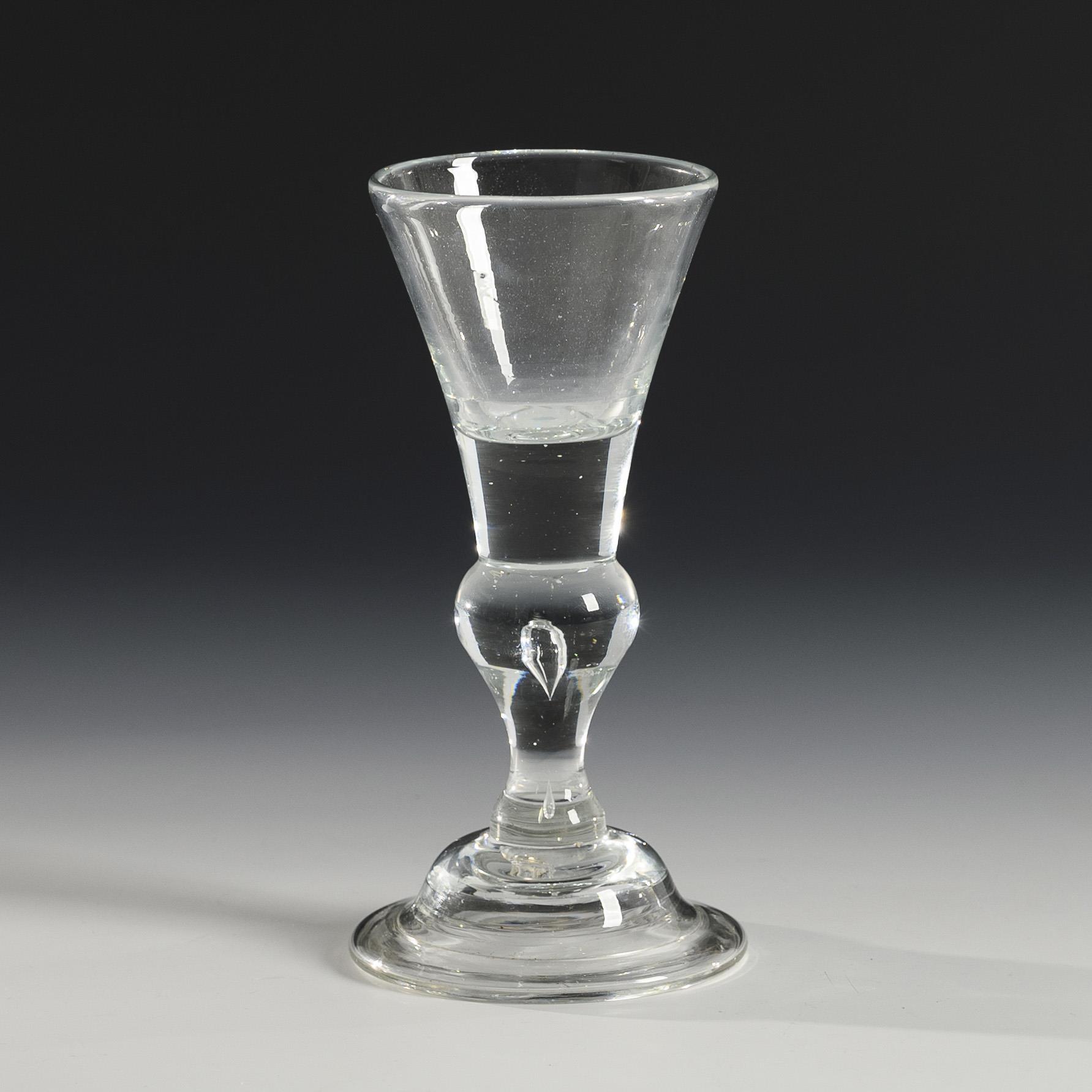 Conical bowl merging into a solid shaft with pierced air bubble, bell-shaped foot with turned rim; pontil mark.