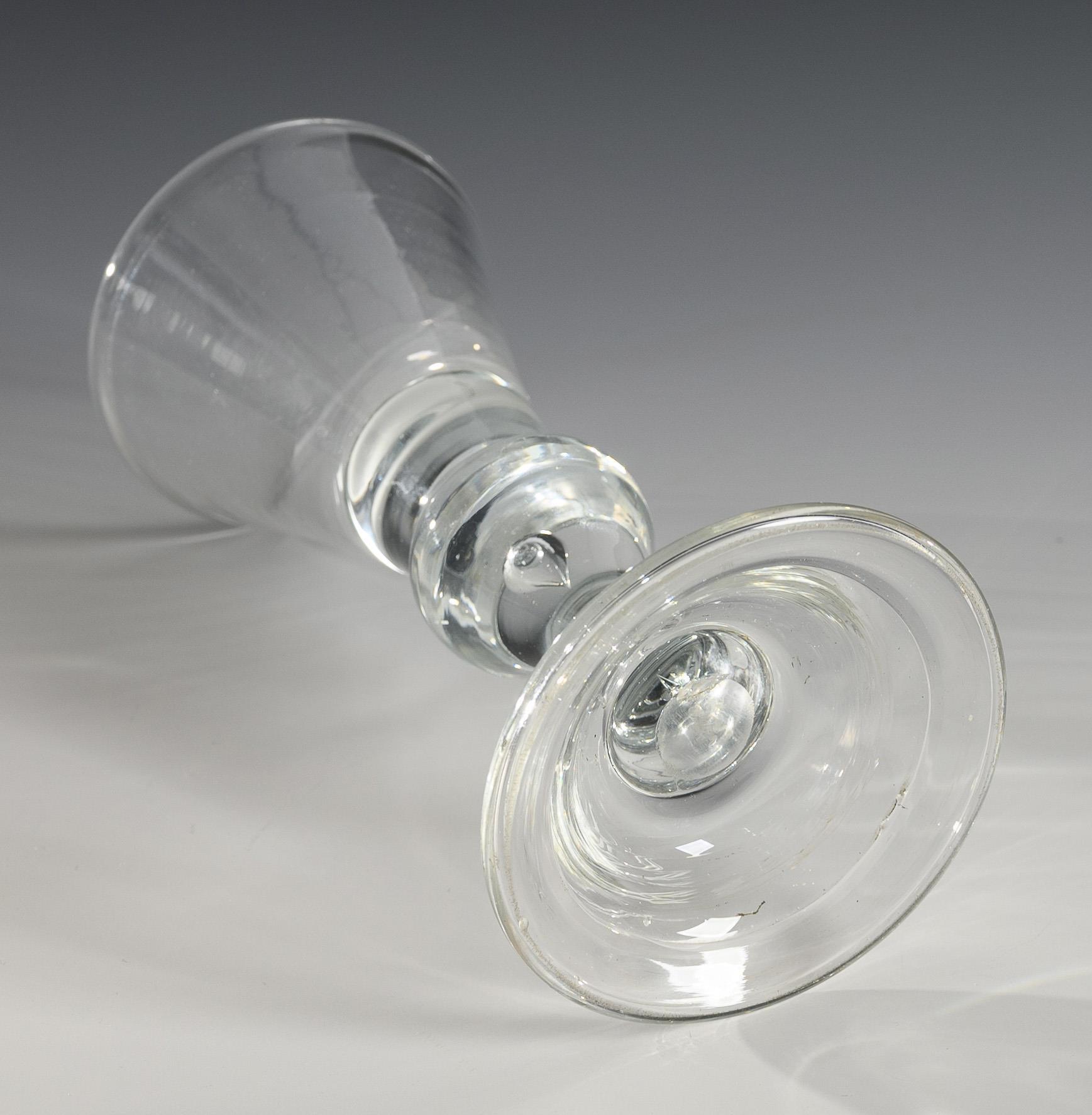 Conical bowl merging into a solid shaft with pierced air bubble, bell-shaped foot with turned rim; pontil mark.