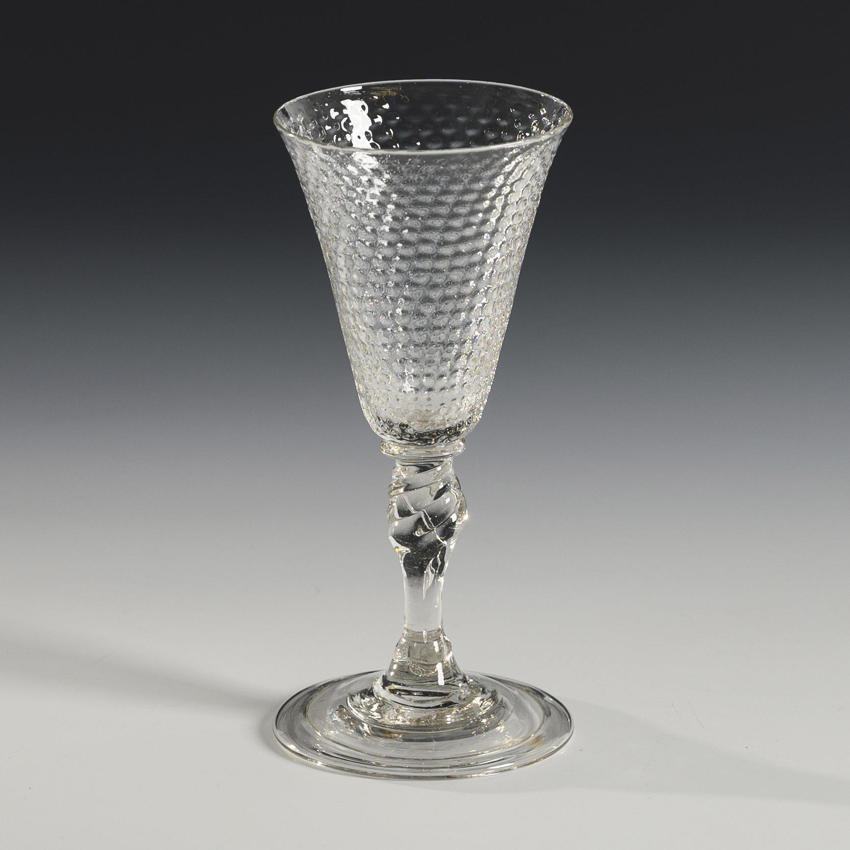 Funnel-shaped bowl with optical rice grain pattern, twisted baluster stem, round foot with everted rim; pontil mark.