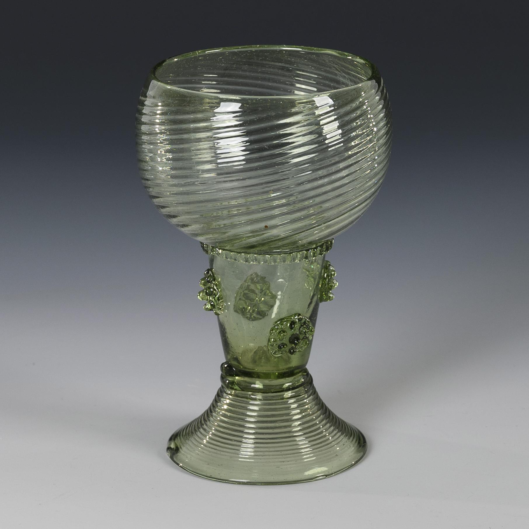 Bulbous, diagonally ribbed bowl, slightly conical and oblique-optical hollow stem open at the top with a zigzag band and four applied berry scales, spun trumpet foot; pontil mark.