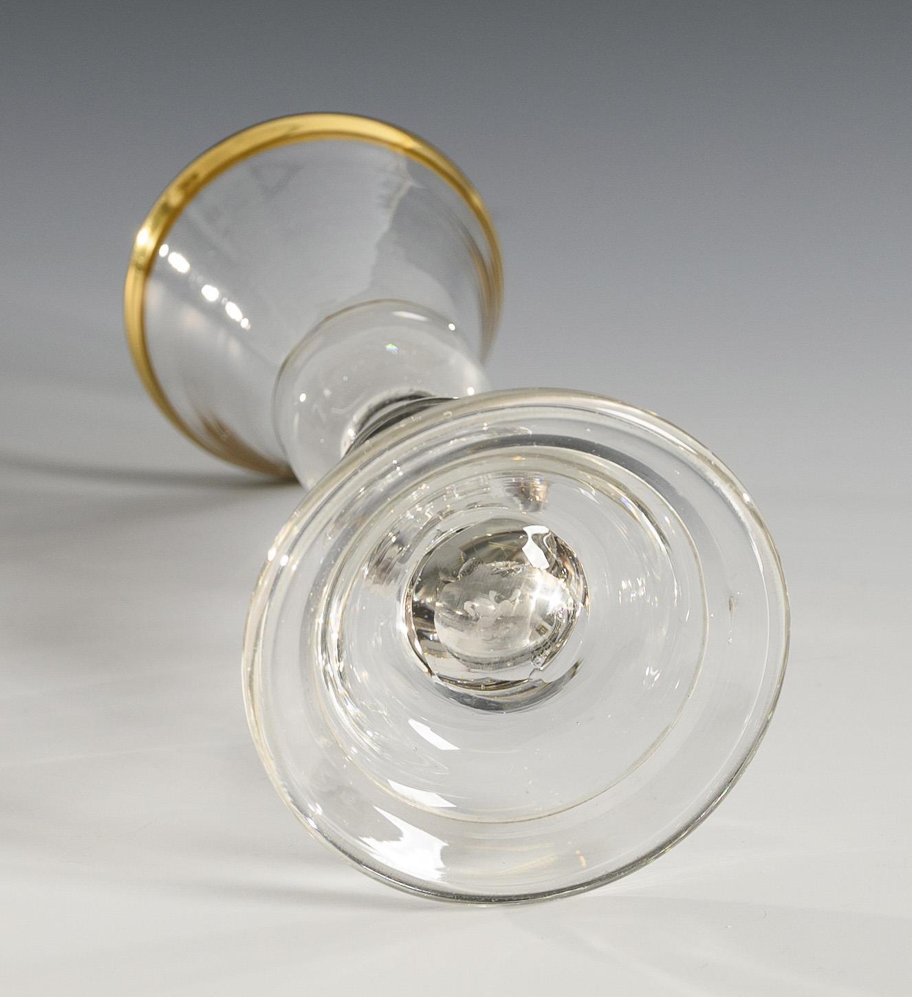 Conical bowl with solid bowl base, baluster stem with pierced air bubble, hat-shaped foot with folded rim; pontil mark with mark.