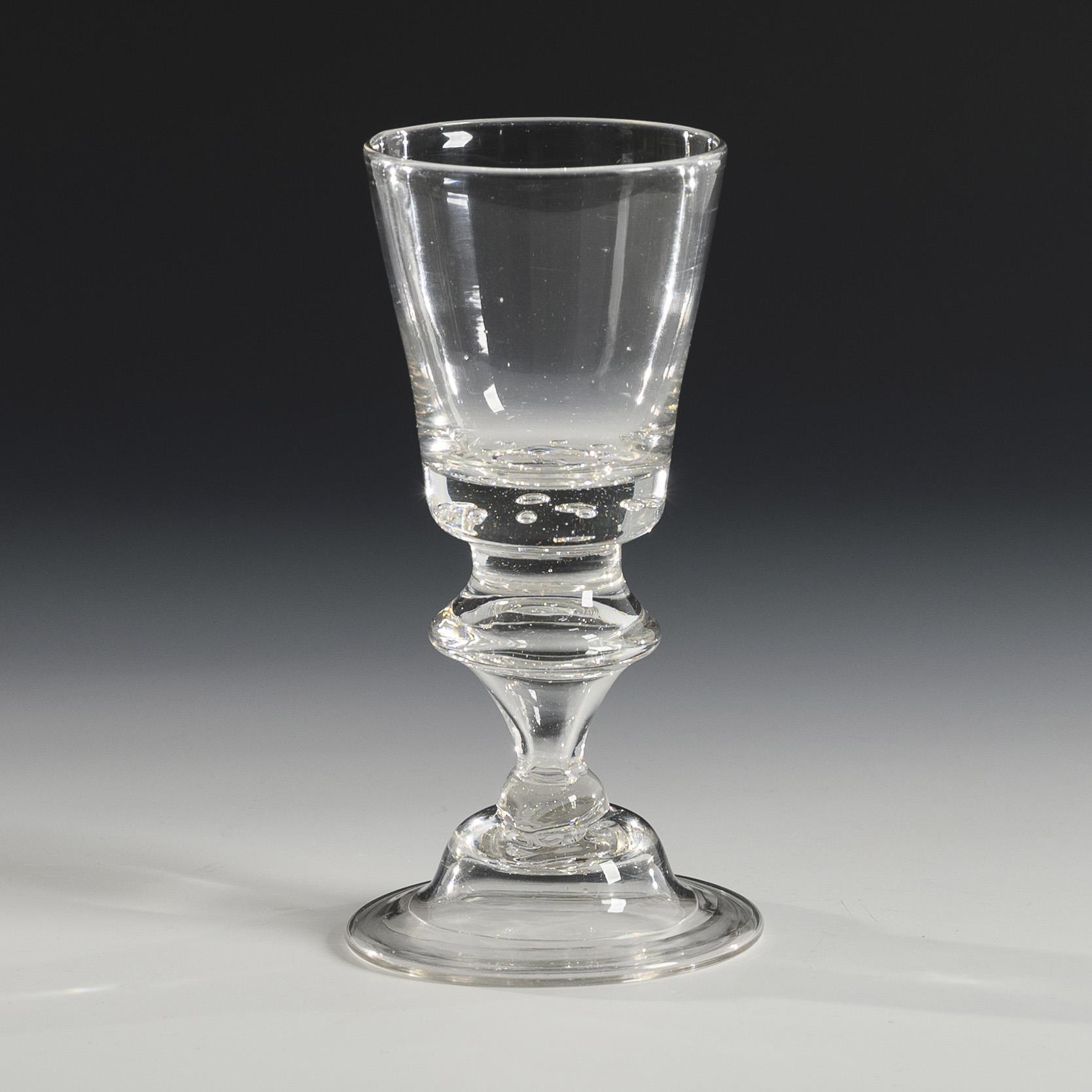 Conical bowl with nine air bubbles in the solid base, hollow baluster stem, hat foot with folded rim; pontil mark.