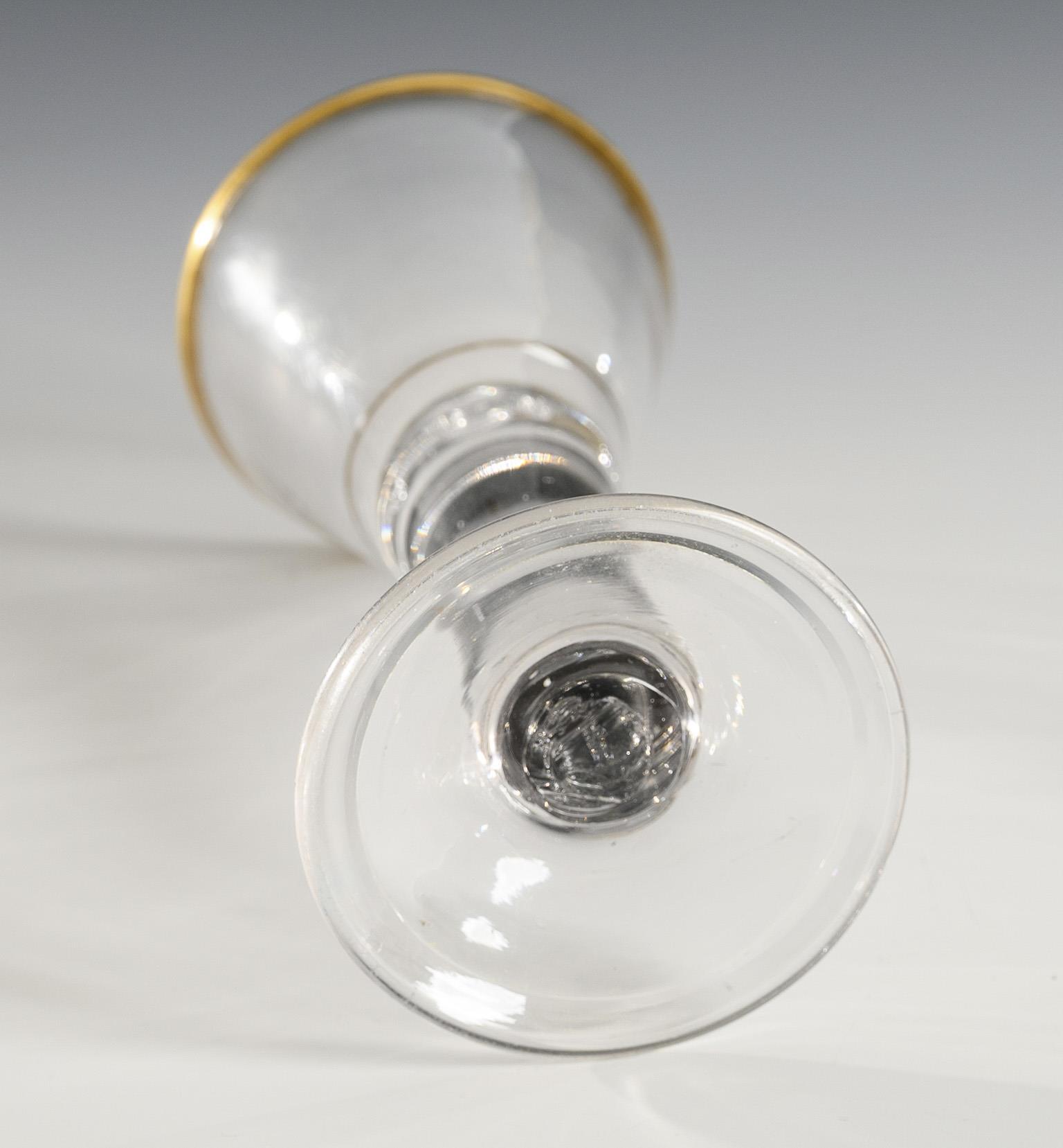 Conical dome merging into the solid shaft with seven pierced air bubbles at the base of the dome, round foot; pontil mark. Minimal gold abrasion.