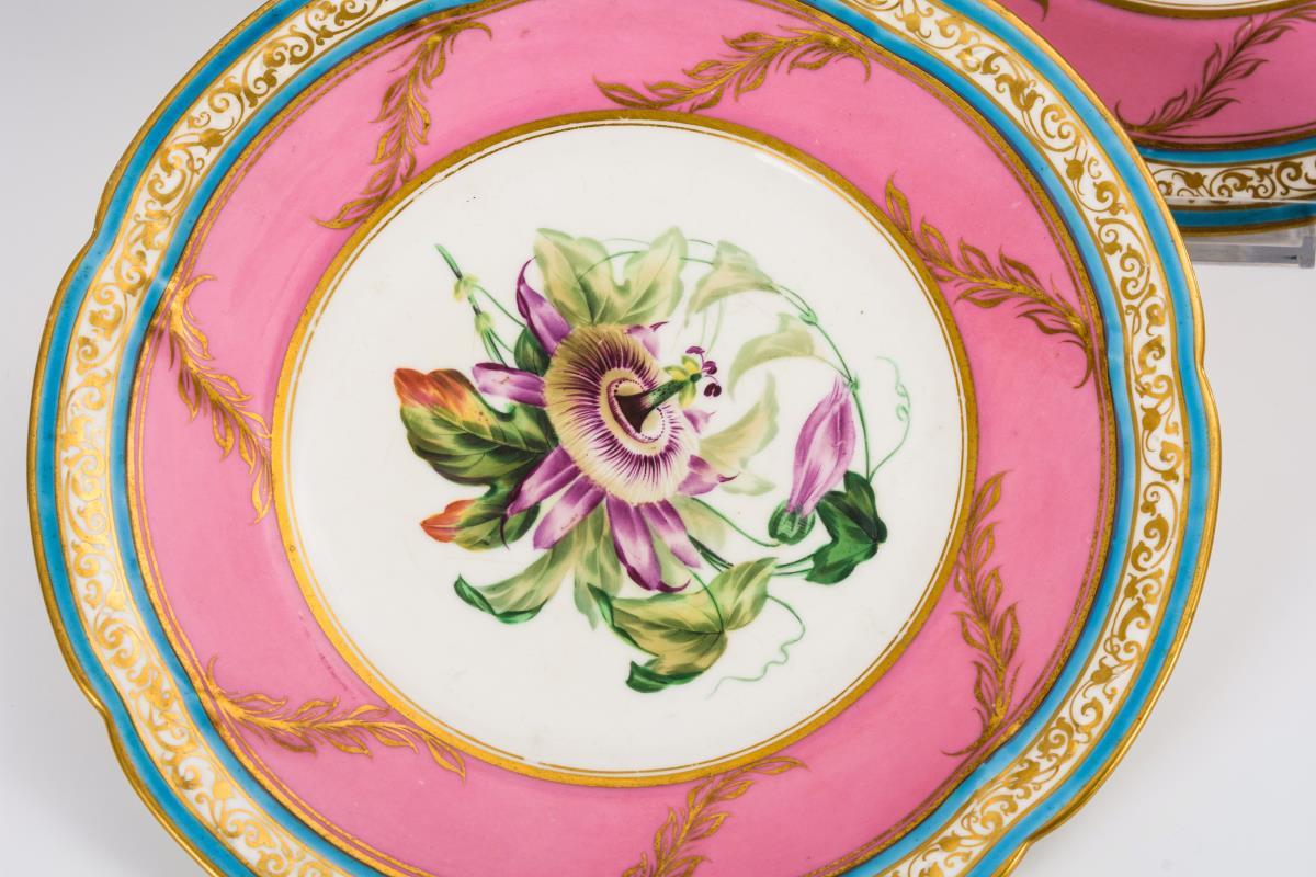 Passige Teller mit rosa Teilfond und reicher Goldmalerei, im Spiegel jeweils eine Passionsblume bzw. Seerose.
