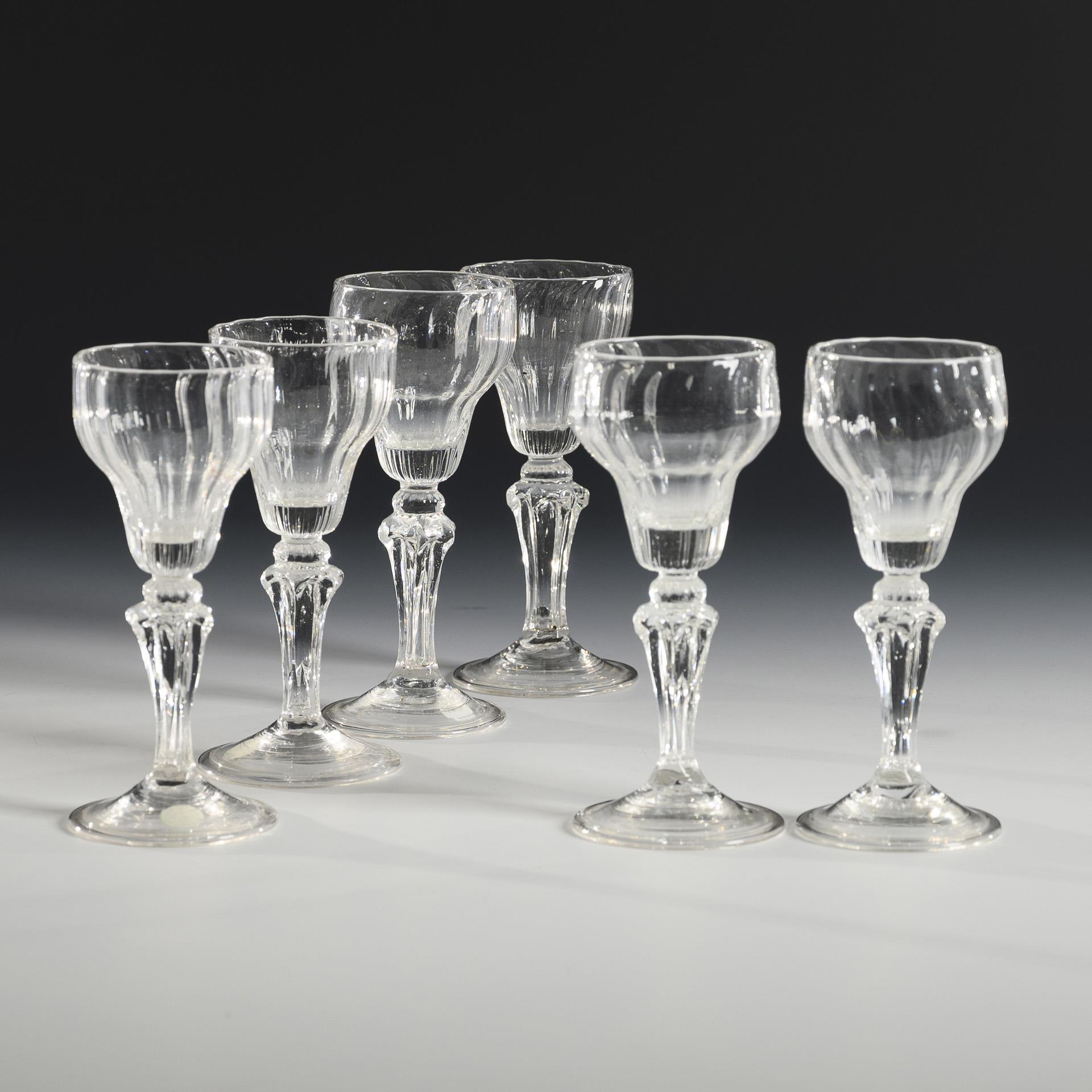 Longitudinally optically mold-blown bell-shaped cuppa, pseudo-faceted shaft, round foot with turned rim; pontil mark.
