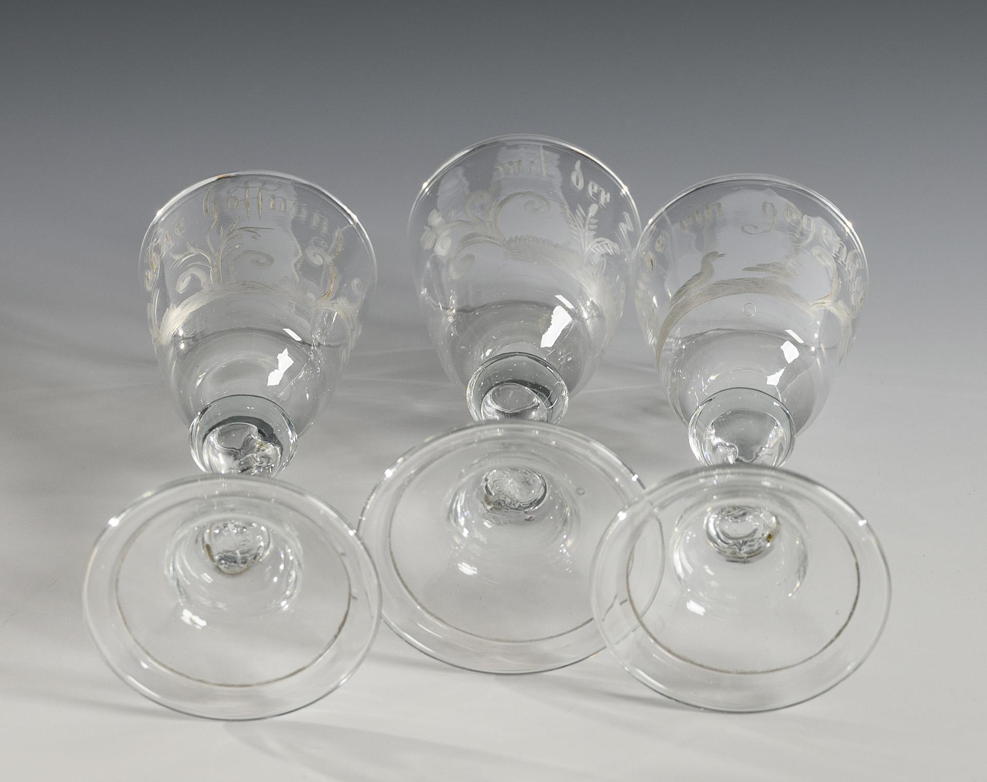 Bell-shaped dome, hollow baluster shaft, hat-shaped foot with folded rim; pontil mark. Engraved vegetal motifs on the dome with a motto ("ich suche ein gegenlieb", "mit der Zeit", "ohne hoffnung").