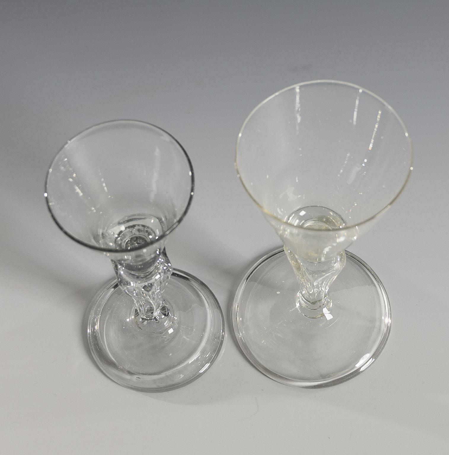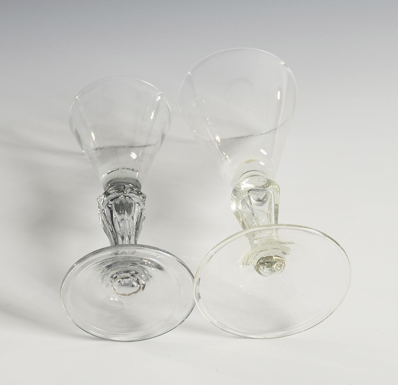 1x North Germany: conical bowl, tetragonal, pseudo-facetted shaft, round foot with narrow turned rim; chipped. / 1x Altare/Liguria or southern France: conical bowl with solid bowl base, hexagonal, pseudo-facetted shaft, round foot with everted rim; pontil mark.
