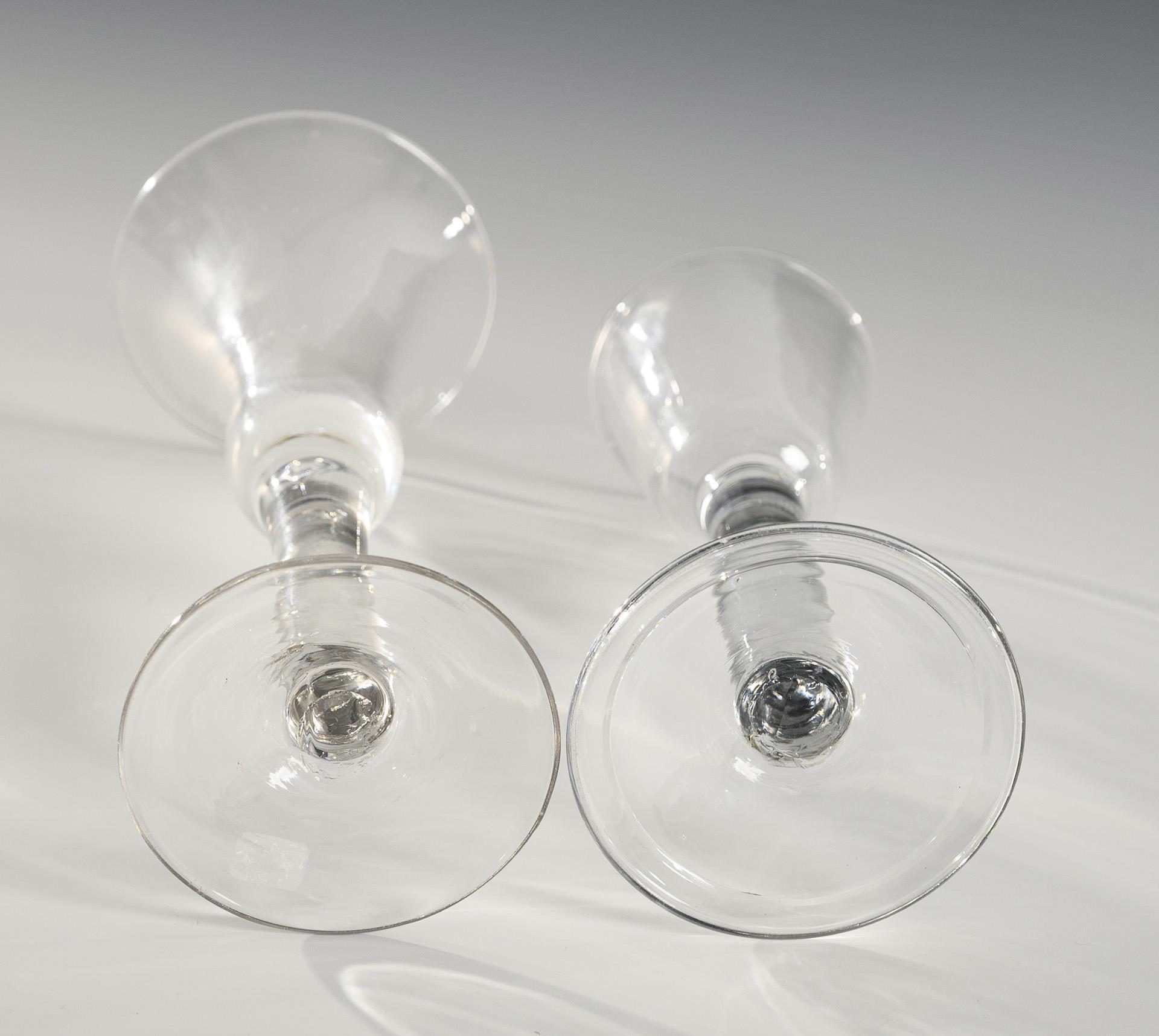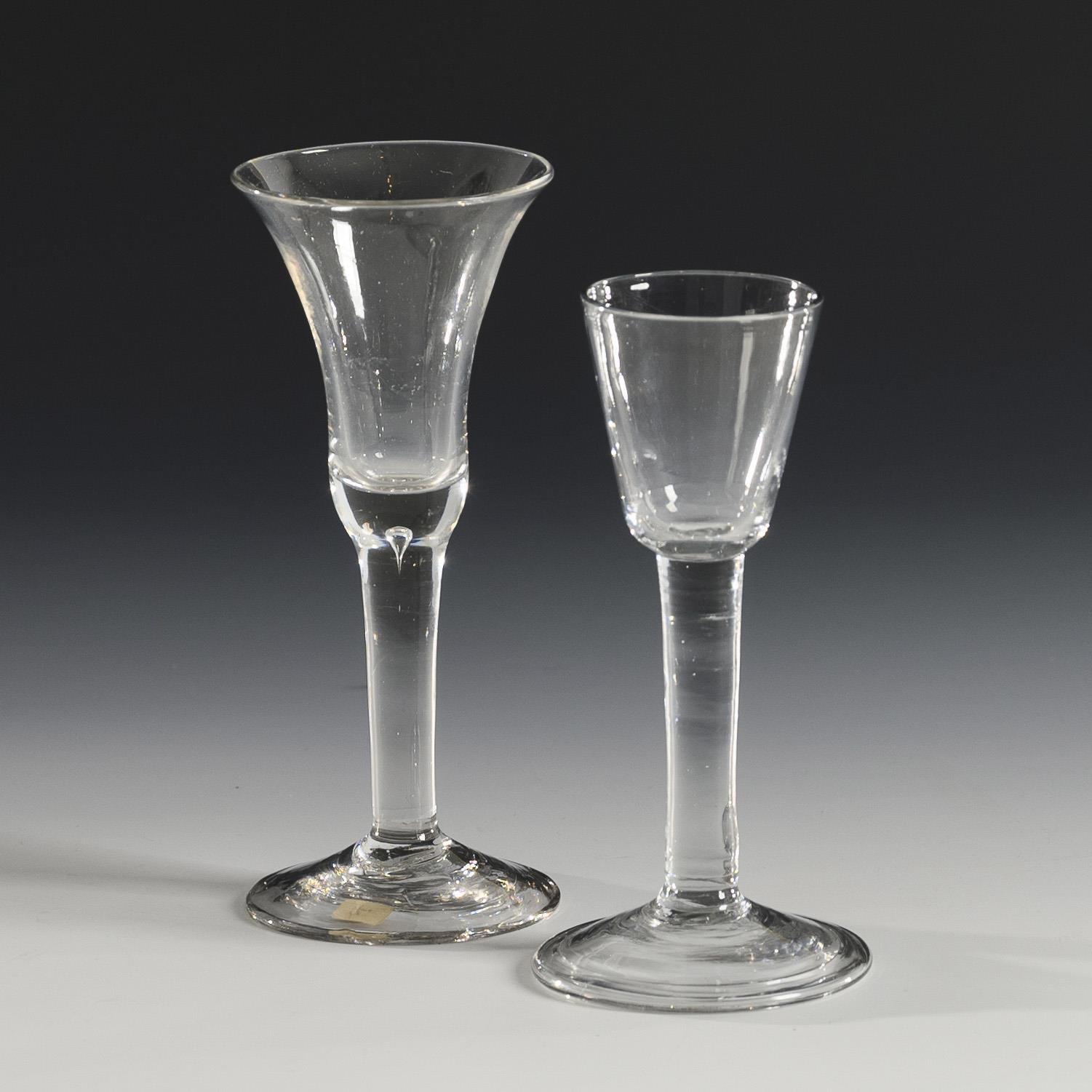 1x German, 18th century: conical dome, solid stem, round foot with turned rim; demolition / 1x England, 1st half 18th century: bell-shaped dome, stem with small, pierced air bubble, round foot; pontil mark.