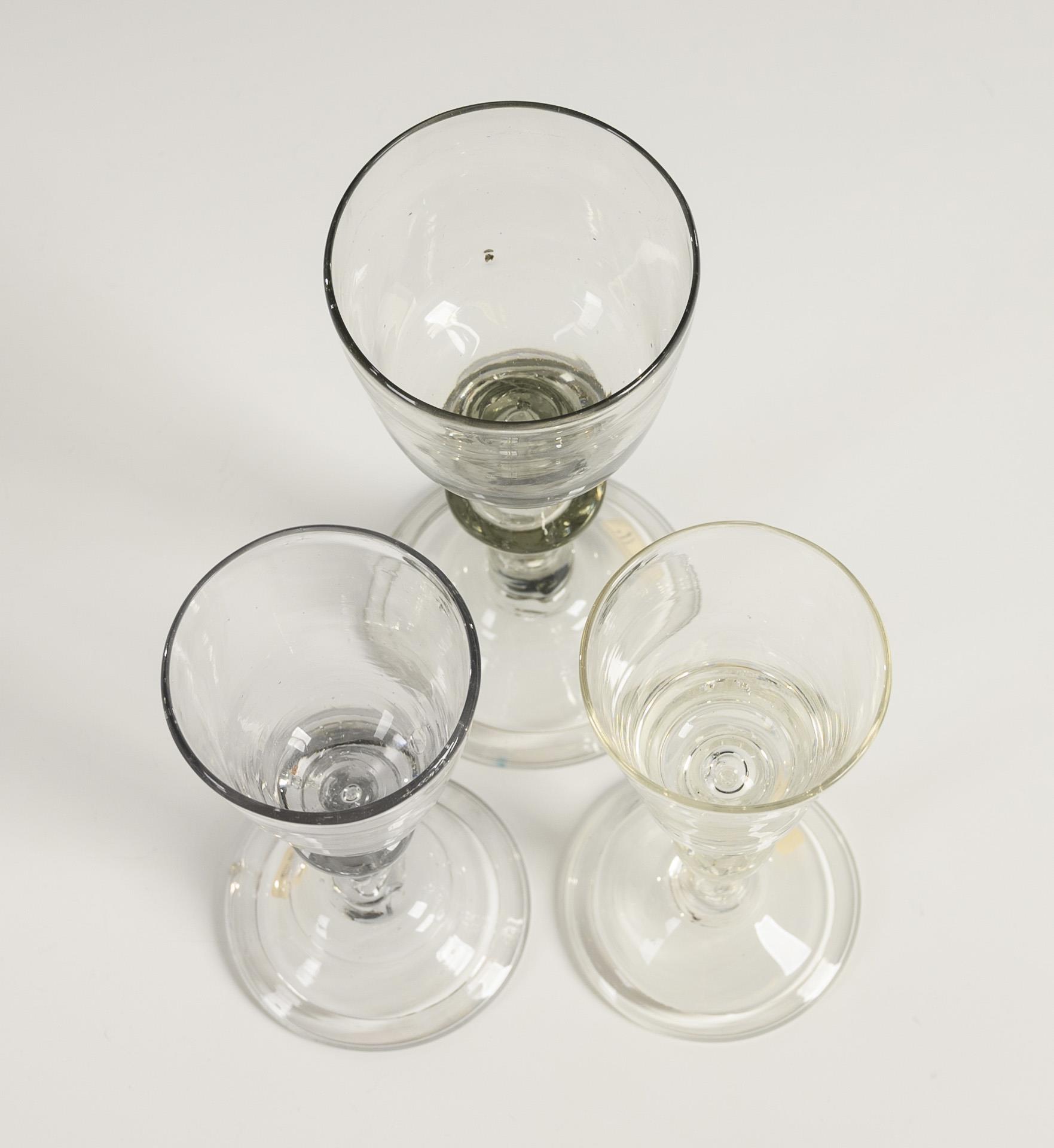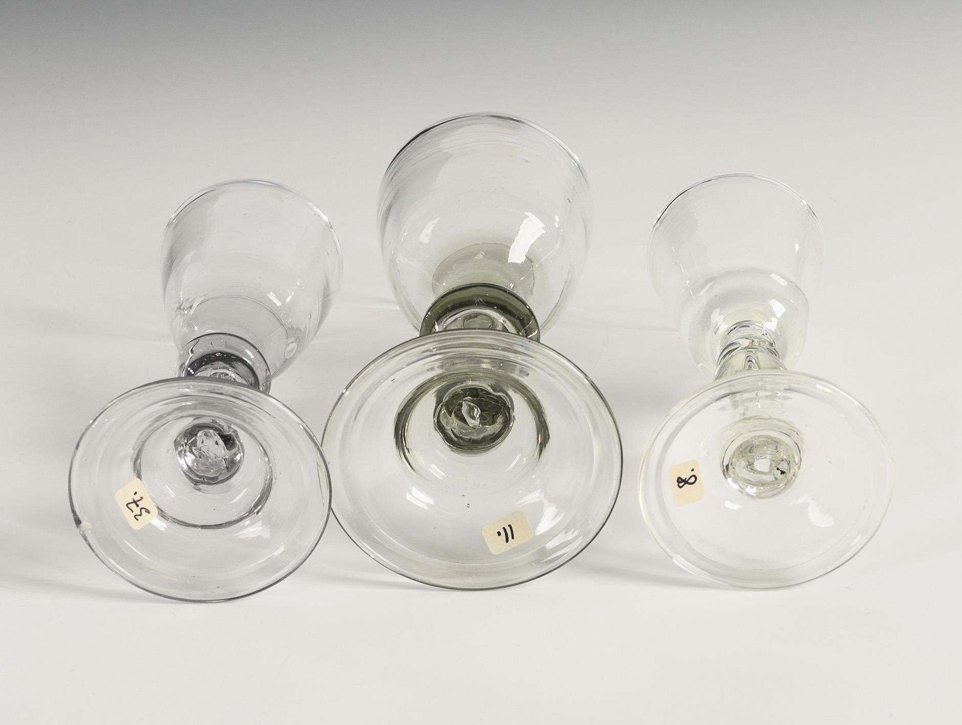 1x France (Alsace?), 1st half 18th century: goblet glass of colorless, slightly greenish glass with baluster hollow stem, round foot with turned rim; pontil mark (H 15.5 cm). / 1x Saxony?, mid 18th century, colorless glass: conical bowl with pierced air bubble in the bottom, baluster stem with pierced, elongated air bubble, round foot with folded rim; cut (H 14 cm). / 1x North German, 2nd half 18th century: Goblet of colorless, slightly manganese-tinted glass, baluster stem with pierced air bubble, bell foot with folded rim; pontil mark (H 14 cm). 1x stone inclusion in the stem.