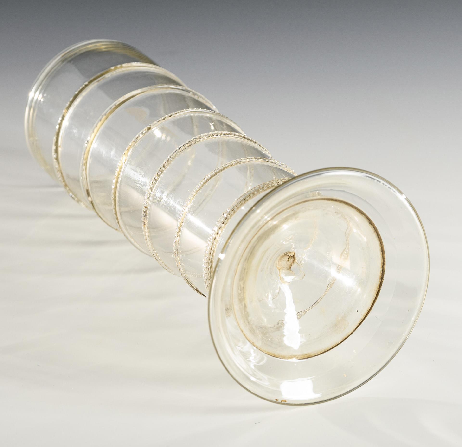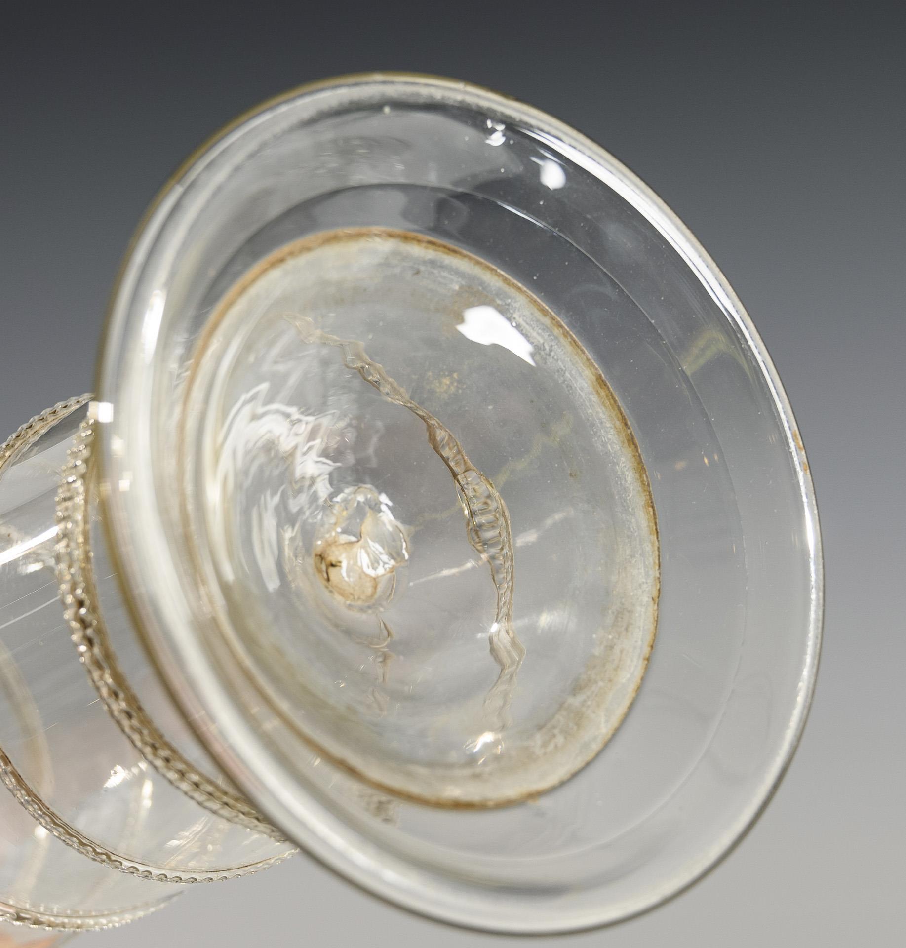 Stemmed glass with six applied, pinched feet, conical round foot; pontil mark.