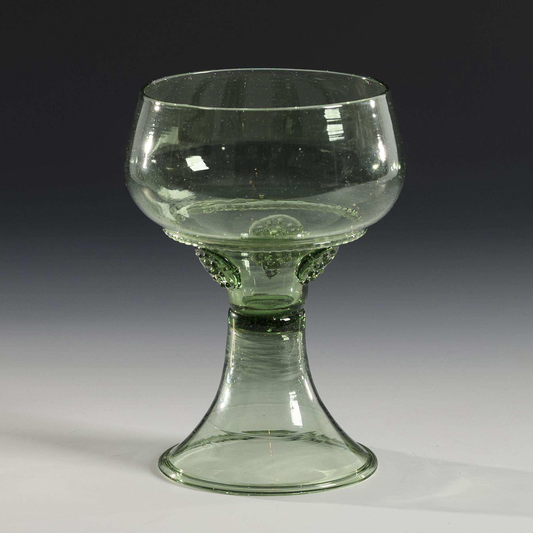 Bulbous bowl with wiggly band and three applied domes on the indented base, trumpet stem with narrow folded rim on the stand; pontil mark.