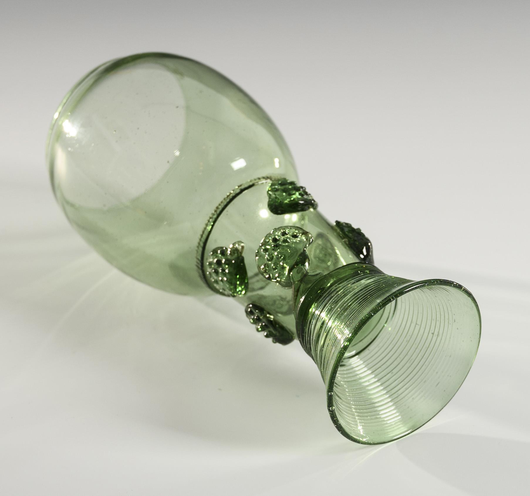Ovoid bowl, cylindrical hollow stem open at the top with eight applied berry scales, small, spun trumpet foot; pontil mark.