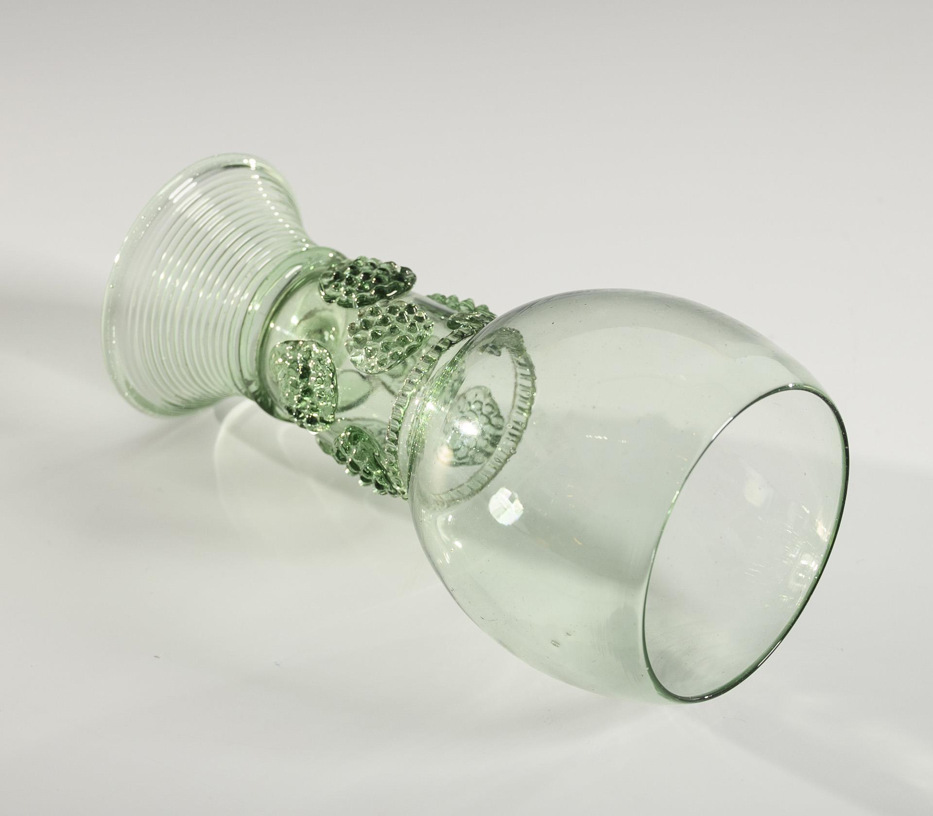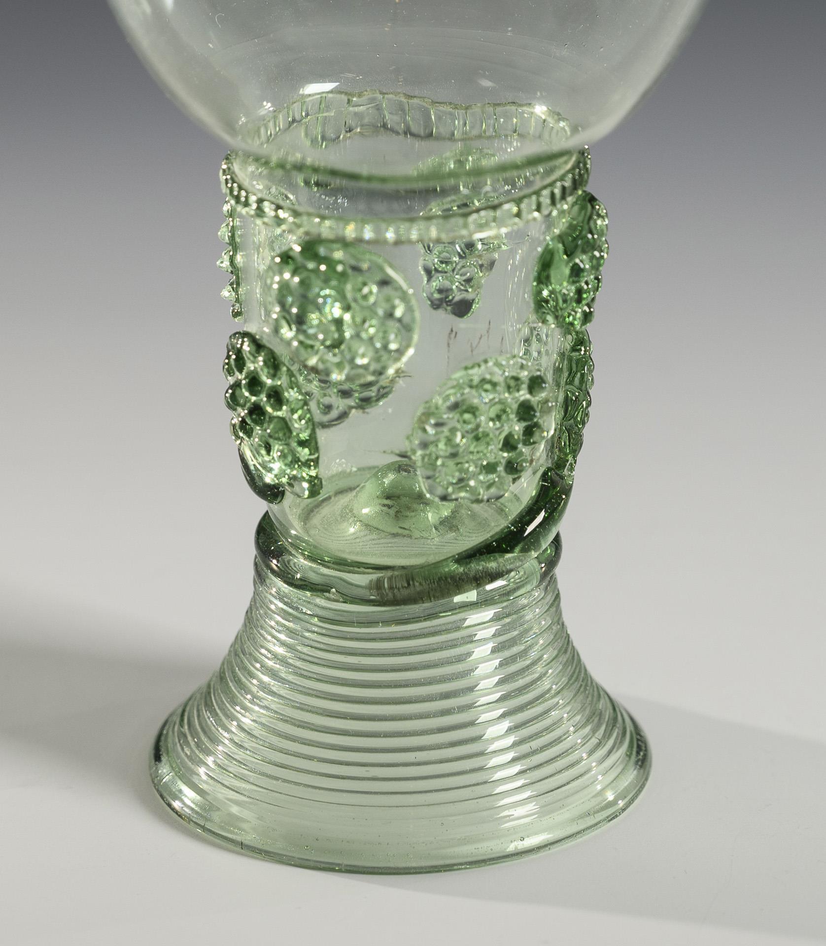 Bulbous bowl, cylindrical hollow stem open at the top with wiggle band and eight applied berry scales, spun trumpet foot; pontil mark.