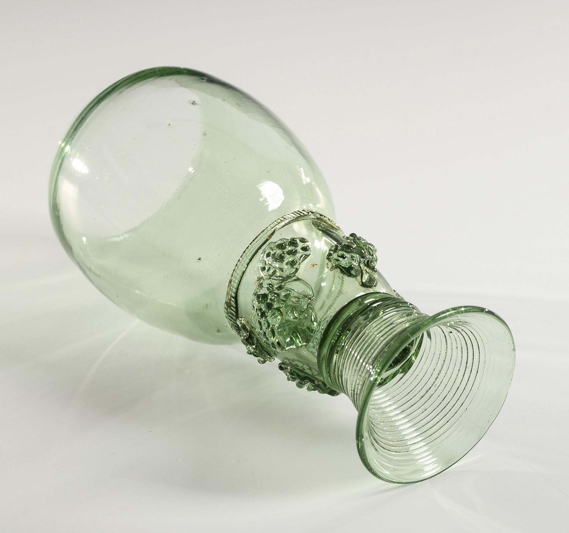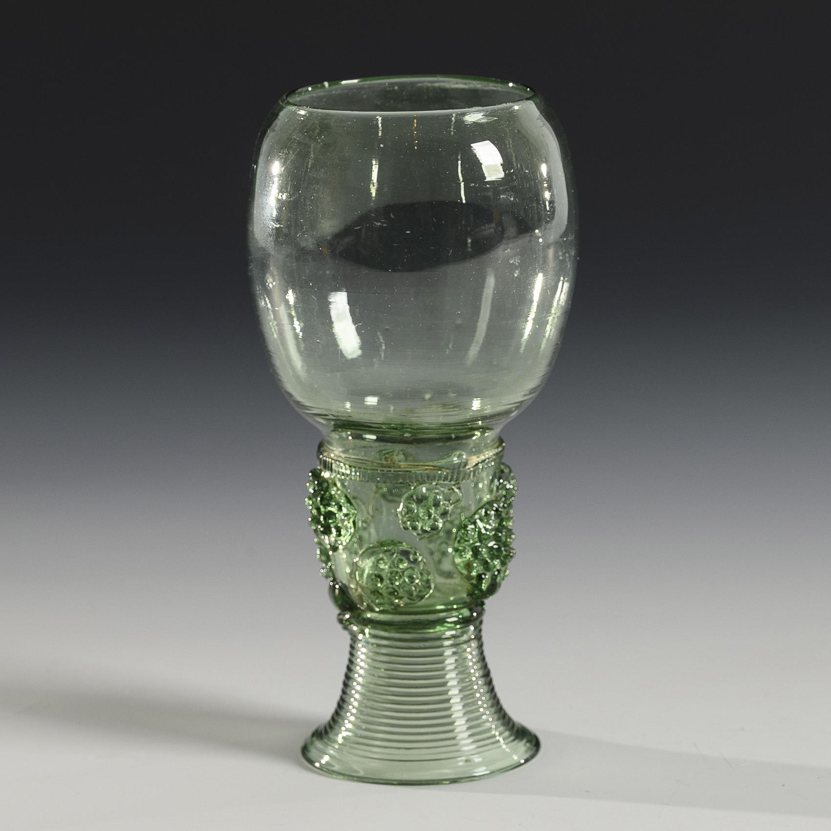 Ovoid bowl, cylindrical hollow shaft open at the top with a wiggle band and eight applied berry scales, spun, small tumbler foot; pontil mark.